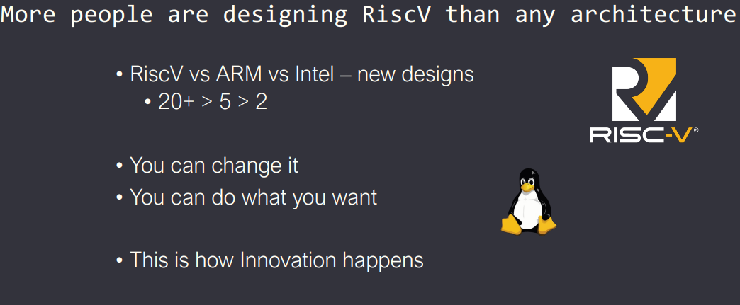 (1)RISC-V是创新的基础设施:开放、可修改、无IP壁垒,这是"创新发生的方式"。