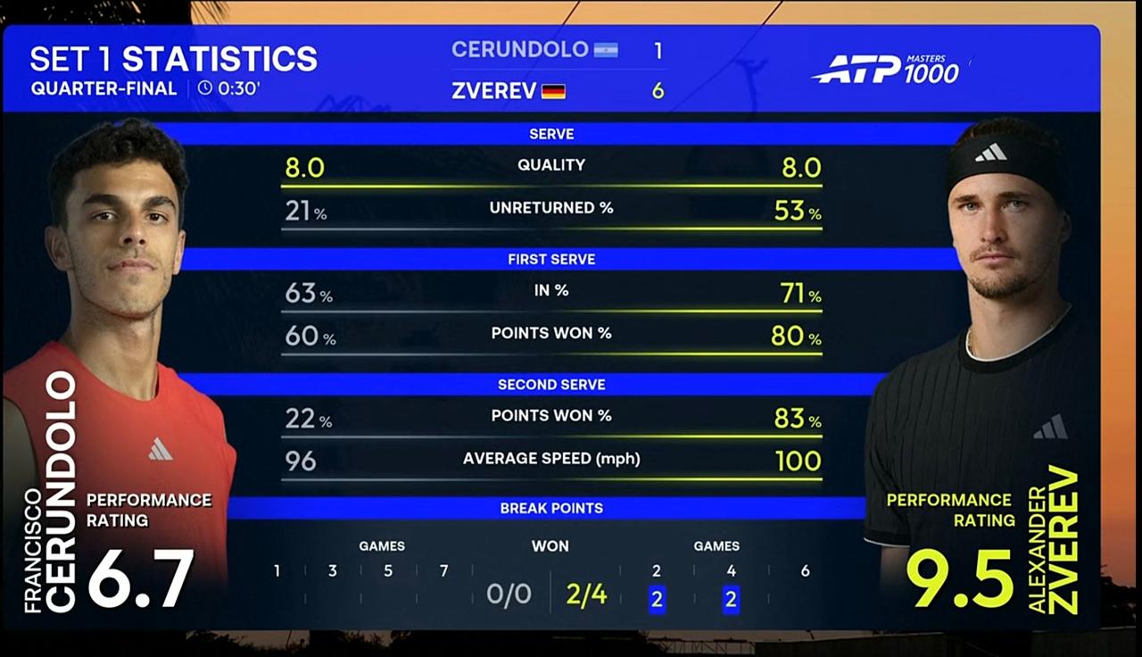 兹维列夫迈阿密大师赛1/4决赛首盘送油条塞伦多洛 北京时间2026年3月27日早上,迈阿密大师赛1/4决赛,兹维列夫对阵塞伦多洛。 兹维列夫状态爆棚,势如破竹,砍瓜切菜一般,以6:1的比分取得首盘胜利。 一上来 ,兹维列夫连保带破取得5:0领先。第六局,塞伦多洛经历两次平分,在第三个局点上艰难保发, 1:5。第七局,兹维列夫发球胜盘局,仅丟一分,顺利保发。 让我们看看接下来会发生什么。