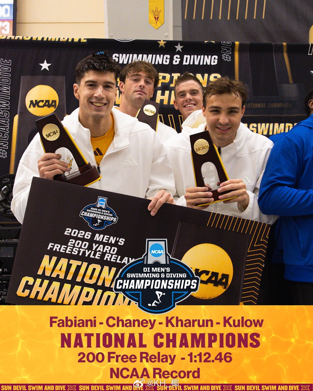 NCAA DI Men's Championships 男子4x50码自由泳接力,ASU游出1:12.46打破Tennessee保持的NCAA纪录!Kharun第三棒游出17.76惊人分段!