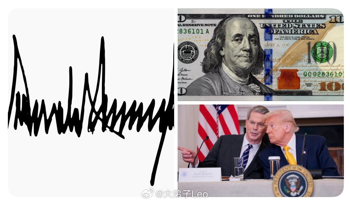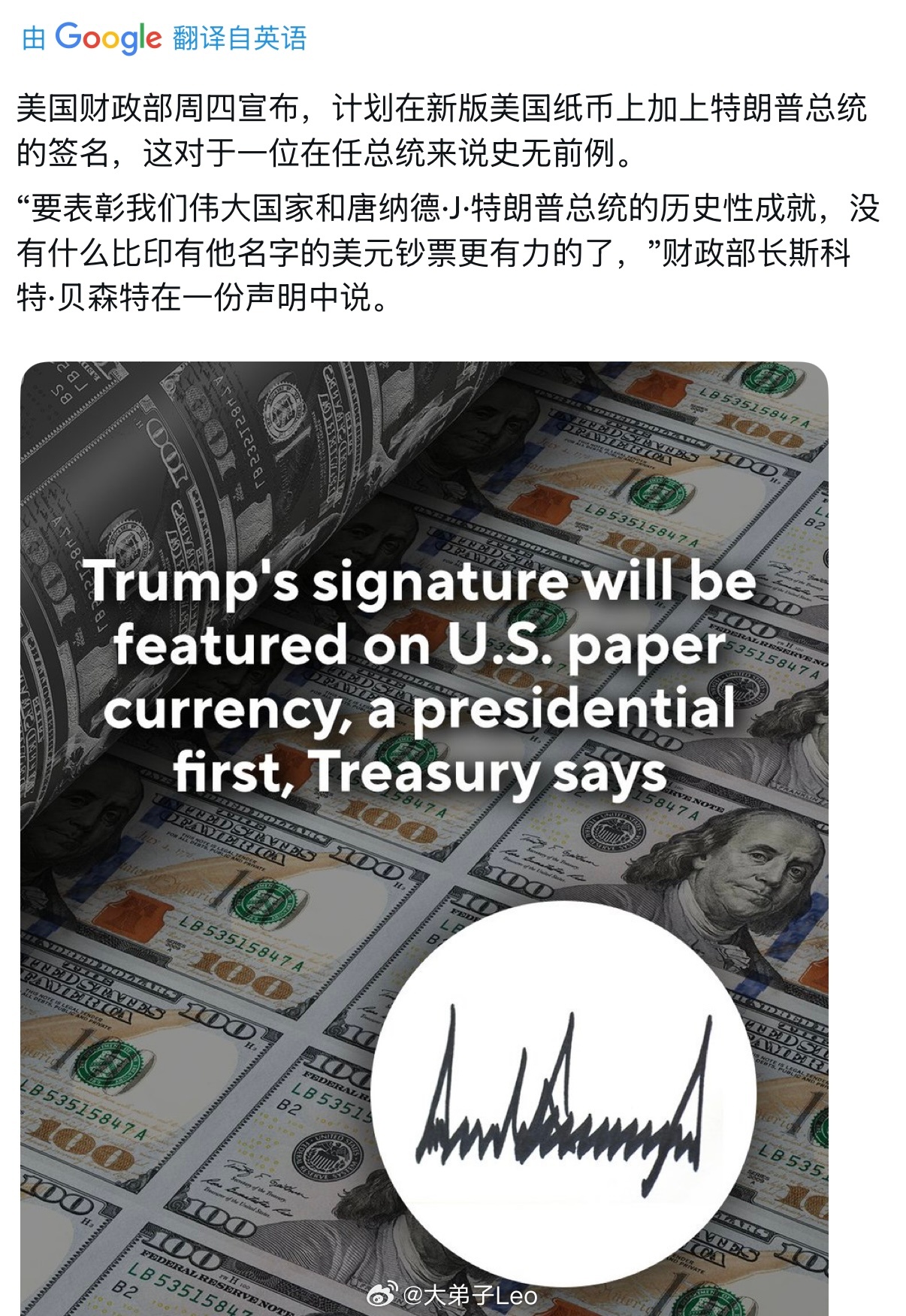 美国财政部宣布,特朗普总统的签名将出现在所有新款美元纸币,这是美国历史上在任总统