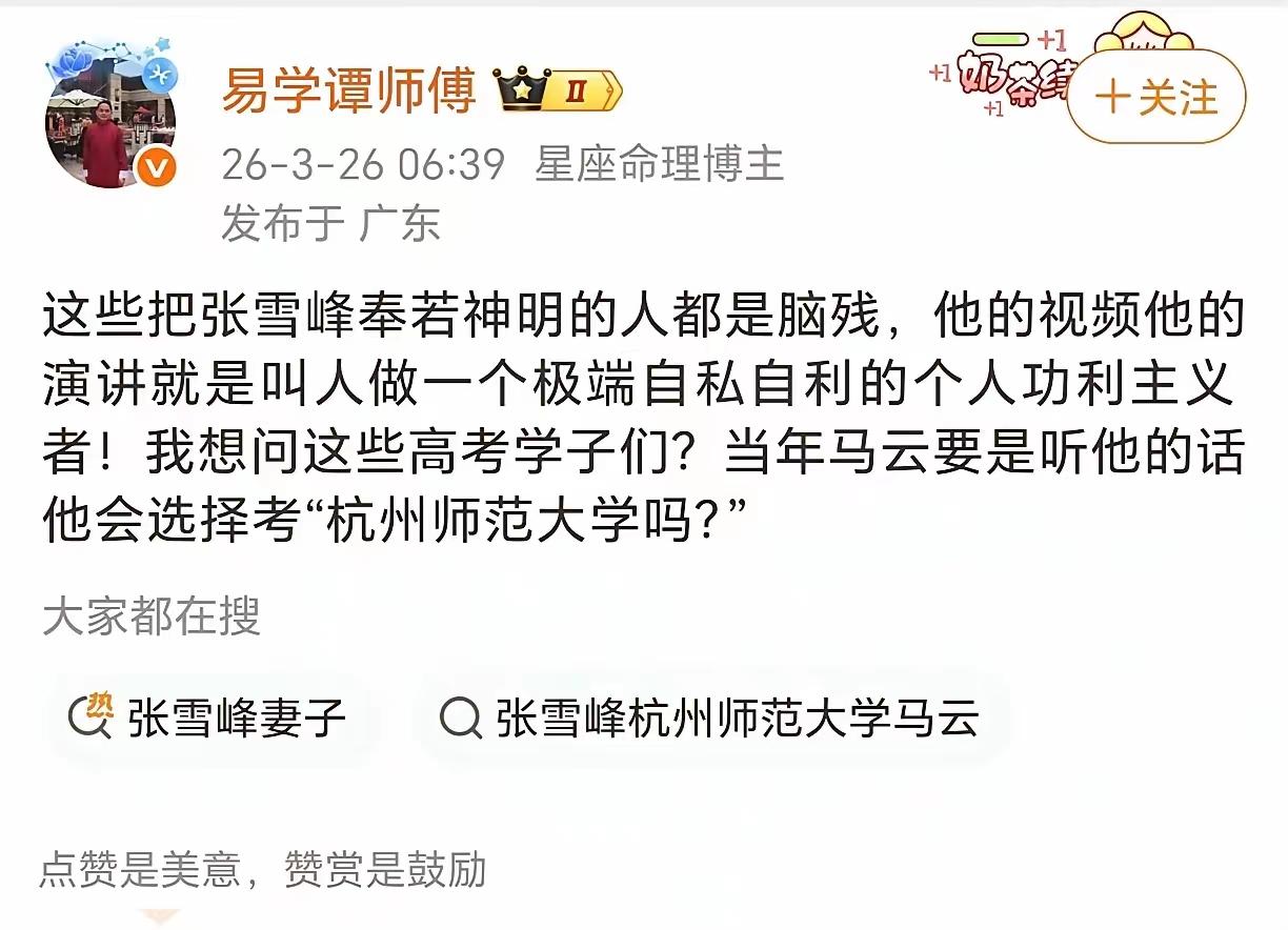 为什么那么多博主出来“黑”张雪峰呢?尤其是这个时间段,人家刚刚过世,你们就跳出来说什么“东北网红数量减一”。在此之前,这位博主也发表过类似批评拿填报志愿当生意,说是贩卖焦虑。第二位竟然说张雪峰是教育人做一个自私的人。还拿马玉举例子,说马云当年停了张雪峰的,还能报考他的大学吗。
