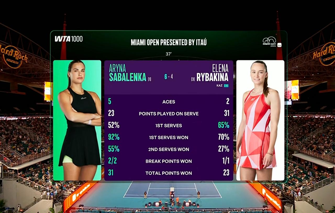 萨巴伦卡WTA1000迈阿密半决赛实现关键破发,赢下首盘 北京时间2026年3月27日上午,WTA1000迈阿密站半决赛,萨巴伦卡对阵莱巴金娜。 第一盘。 前三局各自坚守住自己的阵地,2:1。 第四局,萨巴伦卡在对手握有一个局点的情况下连续追分并逼出一个破发点,随即兑现破发。3:1。 第五局,莱巴金娜逼出连续两个破发点,在对手挽救一个破发点后兑现破发。2:3。 之后各自保发,比分来到4:5,萨巴伦卡领先。 第十局,莱巴金娜非保不可发球局,萨巴伦卡逼出连续两个破发点,随即兑现破发。 6:4,萨巴伦卡拔得头筹。 让我们看看接下来会发生什么。