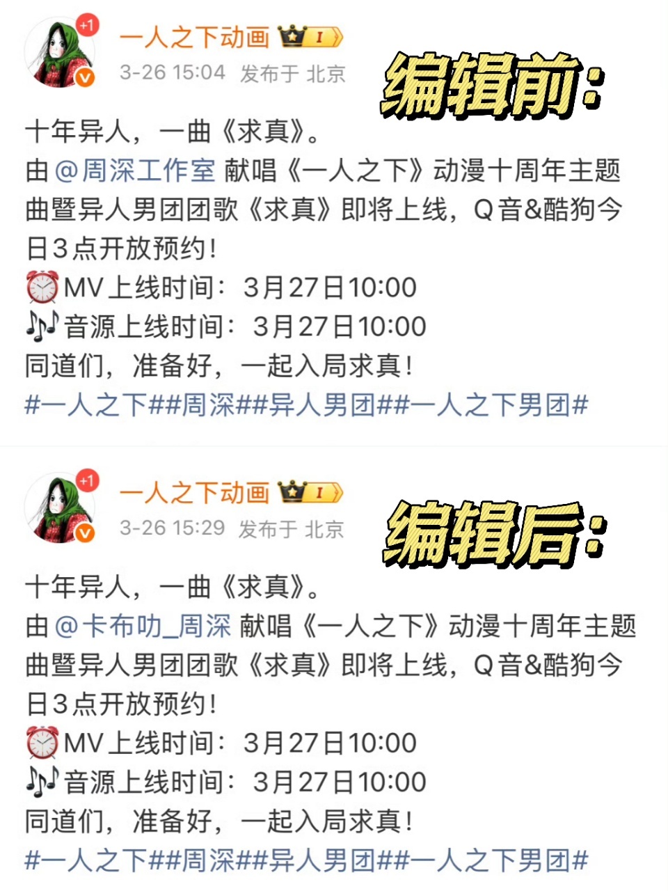 0人看到编辑记录能不笑压力给到周深工作室当看编辑改内容后,事情的好笑程度来到了10000%周深:你新歌周深工作室:你新歌一人之下官方:别争了别争了,一人当一次原唱(bushi周深工作室看见@ 后连夜打开全民K歌开始练…玩梗归玩梗,现实里谁不想急头白脸站上大舞台替老板高歌一曲啊!最后划重点了!十点周深新歌《求真》上线,今晚阅文IP盛典还有首秀舞台喽,不要放过这个周深(和他工作室)hhhhh