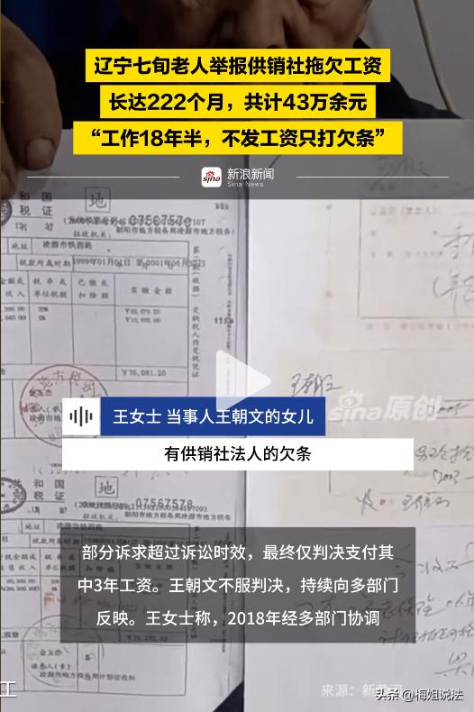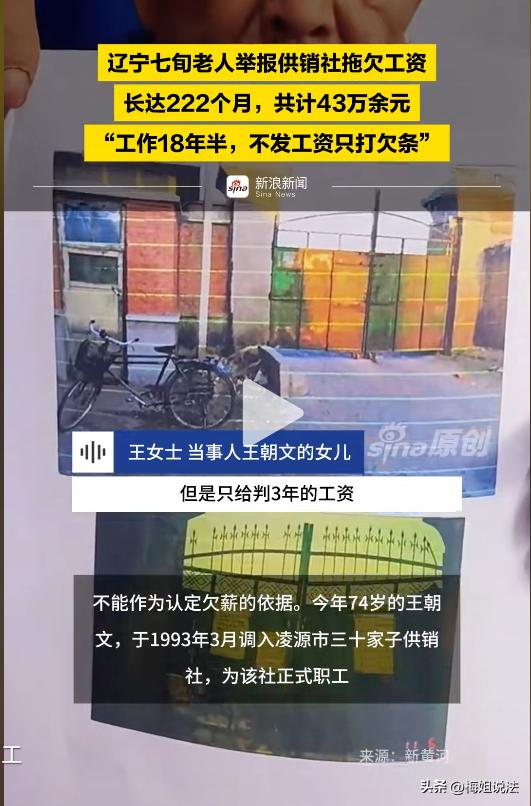 辽宁,74岁老人在供销社干了18年半,工资没拿一分,只有欠条。退休后他拿着43万工资欠条四处讨薪,对方却给出了用3万买断工龄的方案。老人拒不接受,继续上诉追讨。 这到底是怎么回事?老人的工资为什么没有发,欠条还作数吗? 事情还得从1993年说起,40岁的王大爷入职当地的一家店,干过店员和大门值守员。 王大爷当年干活很勤快,每天起早贪黑,把店里的卫生和货物理得干净利落。 这在当时,王大爷这样的工作岗位,是大家眼里的香饽饽,可以一直干到退休。 可是发工资这天,王大爷发现了不对劲,店里没给发现金,只给了一张欠条。 他去找领导,领导说店里经济情况紧张,以后有钱了一次性补齐。 王大爷也是个实心眼的人,没想太多,只觉得自己是正式员工,这么大的店,总不能赖账吧。 没曾想,这欠条一拿,就是整整18年半,一直到退休,店里都没发过工资。 这些年,王大爷多次找领导,可得到的答案就是一次又一次地拖延,和一张又一张的欠条。 2000年6月,店里换了负责人,新的领导跟王大爷签了协议,约定可以先结清7个月的工资,剩下的等有钱了再一起补发。 王大爷拿着7个月的基本工资,就这样回家待业了。 直到2006年,店里体制改革,可以一次性买断工龄,给一笔补偿金。 王大爷不愿意,愣是没签字,毕竟那点补偿金都不够填补家用的。 没想到,事后对方直接不认账,表示王大爷当年已经被买断工龄了,不算店里的员工。 2011年9月,店面被卖掉了,王大爷彻底失业了,那时候他已经在店里干了18年半,累计被欠薪222个月,合计43万元。 2010年,王大爷起诉原单位,要求结清43万元的工资欠款。 结果2013年判决书下来,彻底打破了王大爷的希望。 二审判决认为,王大爷和原单位存在事实的劳动关系,但因单位体制改革等问题,部分诉讼超过了时效,最终只支持了3年的工资返还,约12000元。 王大爷不服,自己18年来用劳动换的工资,只值12000元? 他没有放弃,继续信访上诉反馈。 直到2018年,当地部门接到王大爷的反馈,专门召开了协调会,承认了王大爷18年半的工龄,并承诺会尽快结清王大爷的欠薪。 就在王大爷和家人松了一口气的时候,事后,他们才知道这场协调会没有法律效率,根本不作数。 王大爷的第三次维权又落空了。 2024年,有关部门也表示会尽快落实这件事,但一直没有任何进展。 实在无奈,今年2月,王大爷将此事曝光到网上,引发了不少争论,对方终于松口,提出了一个解决方案。 可这个方案,比任何一次协商结果都要离谱! 对方提出,可以补偿工资、困难补助、工龄买断费,合计3万元,让老人不再追究这件事。 这与43万的欠薪相差太远,王大爷当场就拒绝了。 没想到自己18年来的劳动付出,却得不到应有的工资回报,王大爷彻底寒透了心。 可对方态度坚决,表示司法程序已经走完,只能按2013年的判决执行,补偿老人12000元。2018年的协调会,压根不作数,没有义务再给额外的钱。 王大爷心里清楚,这么多年来,自己不是为了这点钱在声讨,而是要追回每一分属于自己的钱。 很多网友看到视频,都对王大爷抱不平,觉得王大爷受了委屈。 明明王大爷手里有18年来的欠条,只判决了3年有效工资呢? 根据《劳动争议调解仲裁法》第二十七条,一般情况下,劳动争议(比如欠薪),劳动者要在知道自己权益被侵害之日起,1年内申请仲裁,超过1年,就过了时效,可能不支持你的诉求。 但是,如果劳动关系还在存续期间,哪怕拖了好几年,也不受这1年时效的限制。 一旦劳动关系终止,比如你离职了,就要在离职1年内申请仲裁,超过1年,就可能被认定为“超时效”,诉求不被支持。 法院之所以只支持3年工资,是因为王大爷在2011年离职,2010年就起诉了,看似没超时效。 但因为单位改制、待业协议等问题,部分时间段的劳动关系存在争议。 而且他之前的讨薪,没有足够的证据证明时效中断,所以部分诉求超过了时效,所以不予支持。 那么关于“视为已买断工龄”的说法,到底合不合法呢? 供销社主张的“视为已买断工龄”,这完全没有法律依据。 根据当时的改制政策和相关法律,买断工龄是解除劳动关系的一种方式,必须双方自愿,签订书面协议,劳动者签字确认,并且领取买断费,才算真正买断。 王大爷既没签字,也没领买断费,而且2013年法院的二审判决,明确认定他“未买断工龄,劳动关系存续”。 最后,还有一个关键点:王大爷手里的欠条,到底有没有用? 有用是有用,但要结合时效看。 那些被认定为超时效的,庭审虽然不支持,但抵不掉单位欠薪的事实,王大爷可以通过法律途径强制要回。 18年的辛苦钱,43万的欠薪,让一个70多岁的老人四处奔波追讨,太让人心疼了! 你觉得老人是该接受3万的补偿,还是选择继续追讨43万欠薪呢?