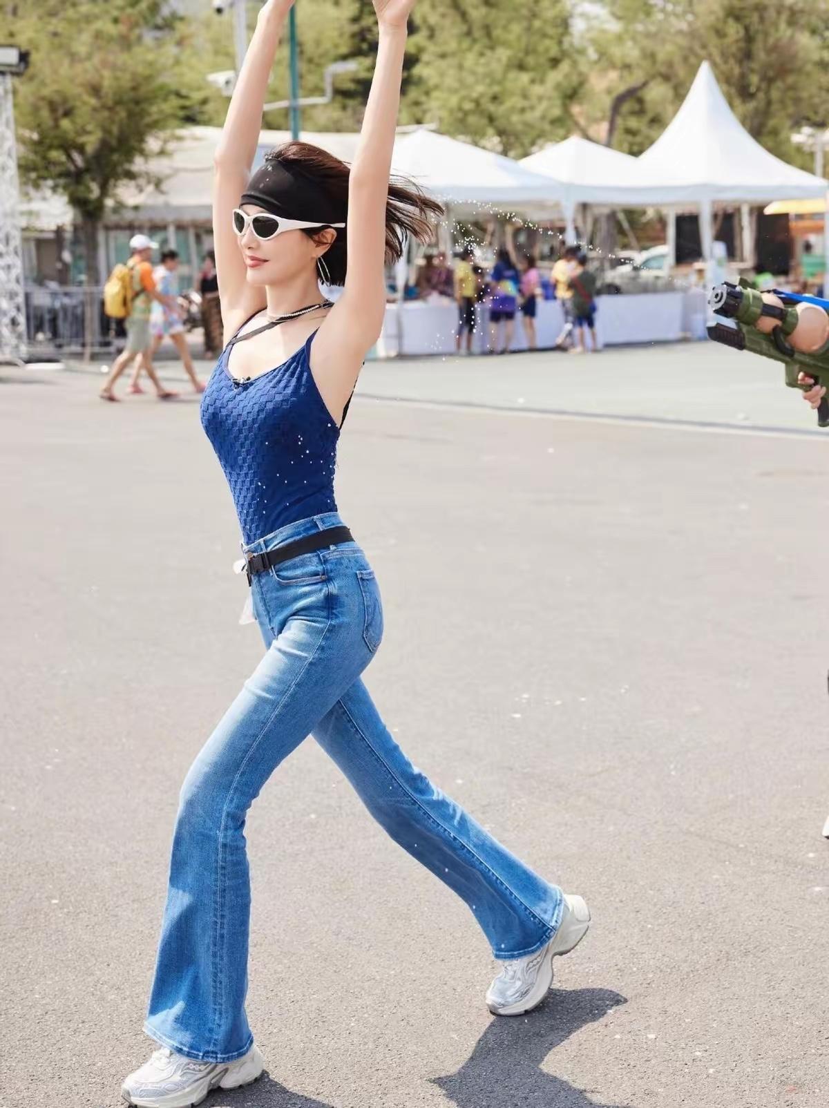 秦岚穿着藏蓝色细肩带吊带,低调沉稳的色调衬得肤色更透亮,带点肌理感的面料贴合身形却不紧绷,自然勾勒出舒展的肩颈线条与清晰腰腹,锁骨利落、肩线平直,没有一丝多余赘肉,清爽又透着恰到好处的精致感,完全不会显得暴露轻浮。下身搭配高腰微喇牛仔裤,精准抬高腰线的设计把身体比例分割得恰到好处,裤身顺着臀腿线条自然包裹,贴合腿部曲线又不勒肉,腰间系着黑色细腰带,腿看起来更长了 她还戴着黑色发带与白色运动墨镜,碎发被汗水微微打湿,再搭配大圈耳环与细项链,增添了几分女性柔美感。玩水时的她状态松弛又鲜活,每一个动作都舒展自然,没有摆拍的僵硬感,水珠沾在发丝与衣料上,反而让整体造型更有夏日氛围感,少了精致距离感,多了几分接地气的鲜活与元气。