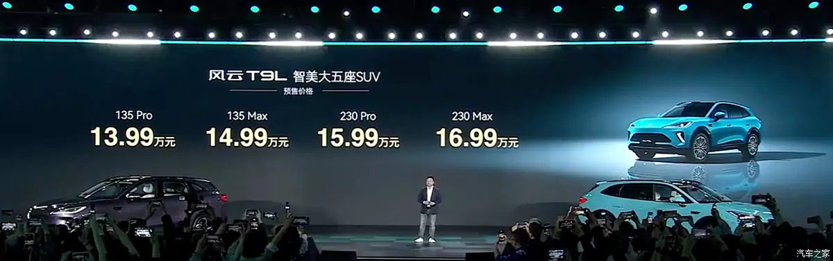 风云竟然有12款产品了,等于再造了一个奇瑞了风云上了一款品牌中型SUV,T9L,内饰跟A9L好像,外观比较有记忆点就是相对于来说,是一个比较偏向年轻运动风格的SUV,前脸下方7层光环的雾灯,比较独特。长宽高分别为4870/1930/1710mm,轴距为2920mm,并会搭载19/20英寸轮圈入门版车型采用1.5L发动机(82kW)+160kW电机+DHT160变速箱的组合,综合最大功率242kW;其它版本搭载1.5T发动机(115kW)+260kW电机+DHT260变速箱的组合,综合最大功率375kW;另外其还搭载犀牛H增混电池,容量32.7kWh,CLTC纯电续航135km/230km,综合续航2000km。底盘采用前麦弗逊、后全铝H臂四连杆独立悬架,还会搭载CDC电磁减振器。风云t9l开启盲订