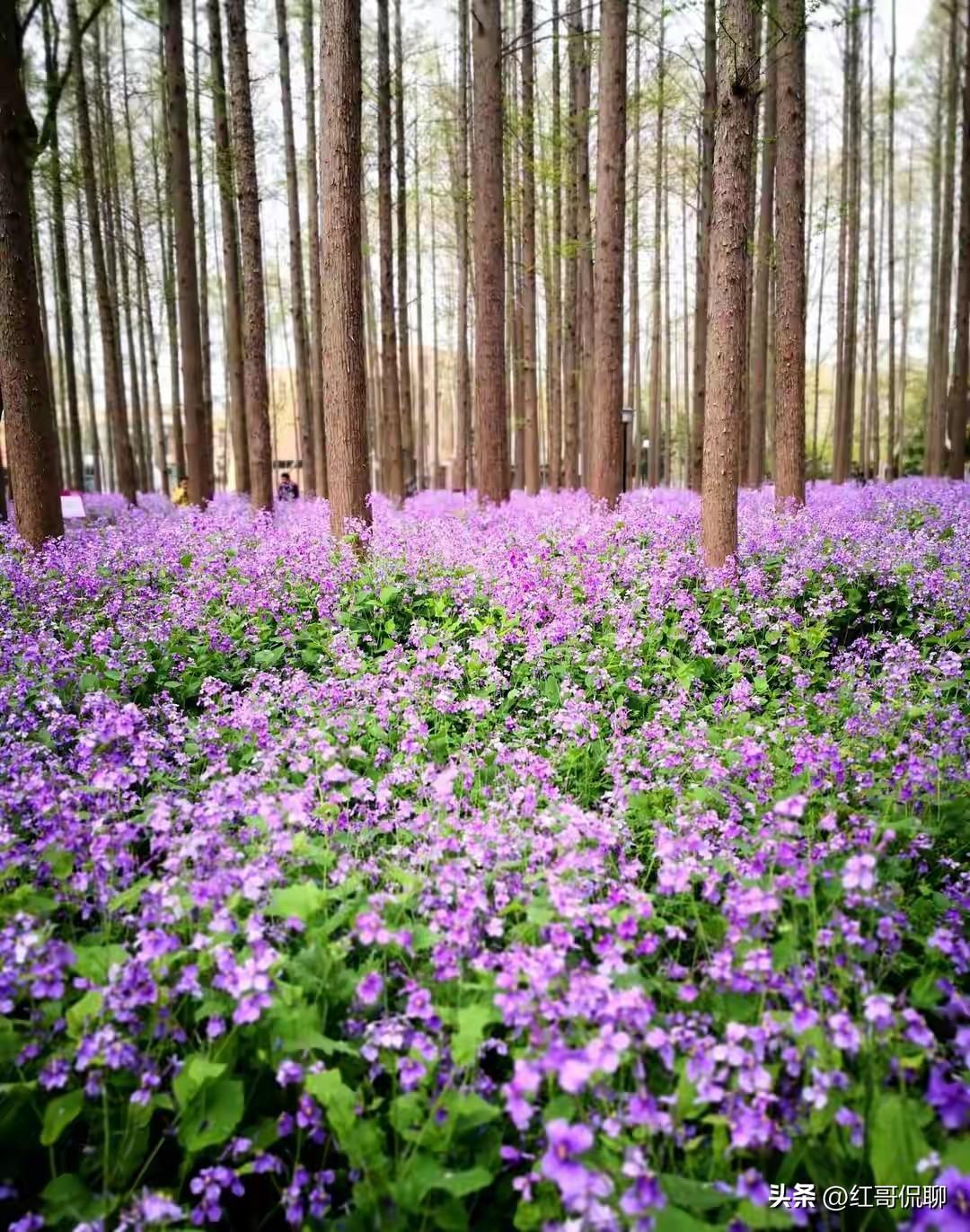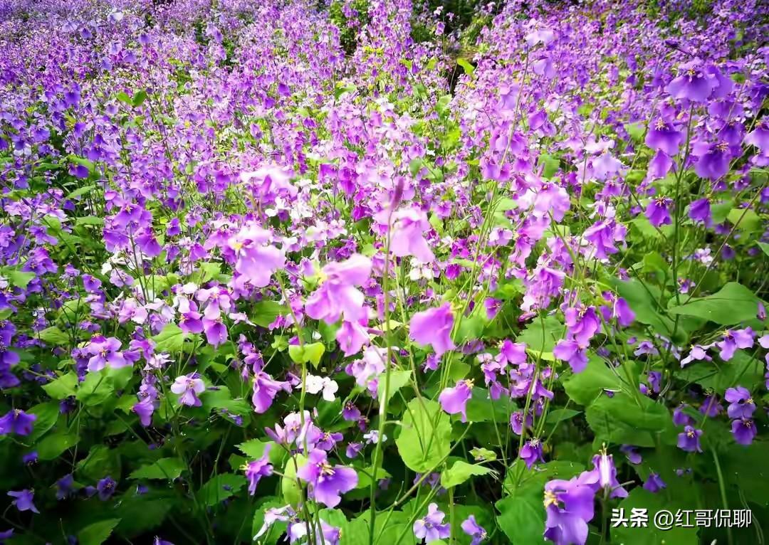 二月兰 初春花开多黄白, 唯君最早送蓝彩, 长长花冠对朝外, 坡上坡下花胜海。