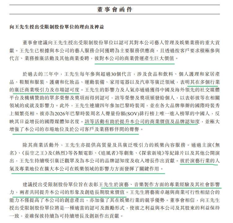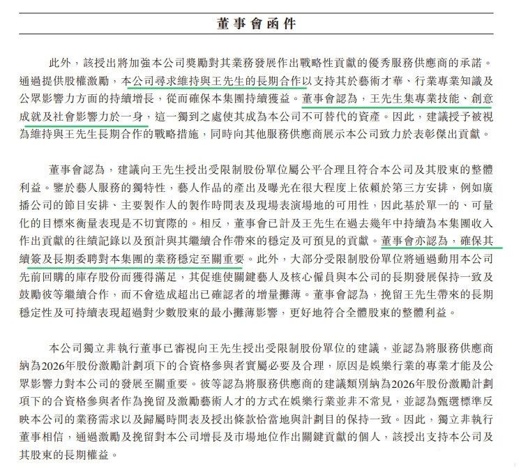 乐华财报2025全年总收入9.07亿元,其中,艺人管理业务贡献了7.49亿元,总比高达82.5% 。乐华的收入主打就靠艺人管理业务,王一博长期贡献了艺人管理的收入的2/3以上。 王一博2025年31个商务代言,皆为最高抬头。探索新境第二季爆火,有路虎、红牛、勇闯天涯、大魔王四大赞助,赛车有嘉实多赞助。王一博光是商务就给乐华带来举足轻重的收入。还有音乐影视作品等收入。 还有间接带来的收入,比如王一博跨年舞台威亚半脱钩安全事件,乐华还拿来置换旗下艺人的芒果台资源。 乐华在董事会函件中长篇幅明确指出:王一博集专业技能、创意成就及社会影响力于一身,确保其续签及长期委聘对集团业务稳定至关重要。 但是公司的重视来得太晚,对公司得以上市的大功臣没有给予股份。现在公司才建议的股份激励诚意不足,那点限制性股份不过相当于王一博的一个商务代言,它还要分四年给。 乐华宣传的由艺人驱动转向“机器人+AI+IP”转型,不过是哄住股东,掩盖王一博合约到期不续约之后的营收将面临的困境罢了。