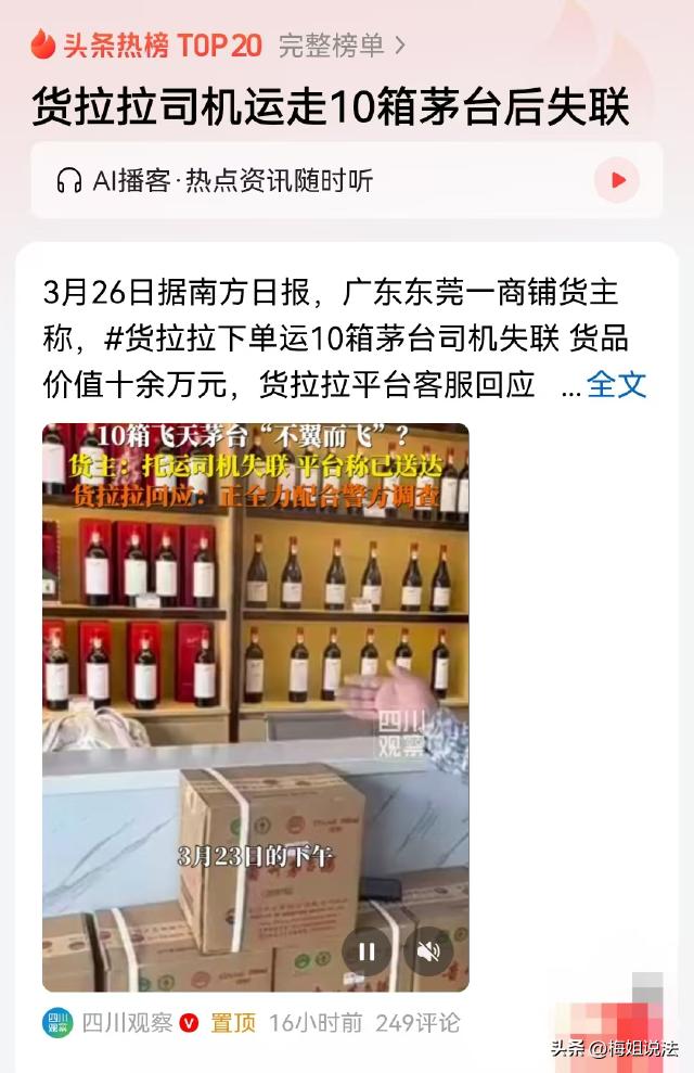 广东东莞,男子找了个货拉拉,把价值十几万的10件2000年飞天茅台送往广州,可司机装走酒就失联了。男子赶紧找客服询问,对方却说货已送达,男子想要司机的联系方式,客服却说要保护司机的隐私,拒绝提供。 据、四川观察报道,男子开了一家很大的烟酒行。3月23日下午,店里要往广州发一批飞天茅台。 这批酒一共有10件,是2000年的老酒,加起来价值十好几万。 男子找了个货拉拉,过了一会,司机开着车过来了,众人将酒搬上车。 按理说,从东莞到广州,一个多小时就能送到,可是过了很久,广州那边还是说没有收到货。 男子还以为路上有事耽搁了,就想联系司机问他到哪了,可让他没想到的是,电话怎么都打不通。 男子急了,这批货可不是个小数目,万一出现差错,那损失可就大了。 一连打了几次都联系不上司机,男子赶紧联系了客服,可让他没想到的是,客服说这批货已经安全送达。 男子顿时感觉安心了,还以为就在自己联系司机的空档,酒已经送到了,可等他再次联系广州那边,对方还是说没有收到酒。 男子非常愤怒,再次联系客服,但是事情一直没有解决,酒和司机都找不到。 更让他生气的是,按理说23号和24号是最关键的两天,平台应该及时介入调查,可对方没有主动联系他一次,也没有拿出任何处理解决事情的态度。 转眼就是几天过去,这十件酒就像人间蒸发了一样,怎么都找不到,迫于无奈,男子只好报了警。 期间,男子想问客服要司机的联系方式,但是对方称这是司机的个人隐私信息,不能提供给他。 男子非常愤怒,可平台那边也很无奈,他们回应称,现在他们也联系不上司机了,这个司机自从注册后,一直老老实实的,从来没有出现过类似行为。 至于男子第1次问客服的时候,客服回应显示已送达,是因为在男子之前一个小时,有出现类似的情况,客服搞错了。 平台表示,会全力配合民警调查此事。 有人说司机真刑,十几万的货值,够判好几年了。 也有人说,现在大家都懂法,司机不可能犯这种低级错误,很可能中途出现意外了。 那么,如果司机是见钱眼开,故意失联想将酒占为己有,这种行为应该如何认为? 如果司机故意占有这批价值十几万的2000年老酒,他的行为就涉嫌侵占罪。 根据《刑法》第二百七十条规定,将代为保管的他人财物非法占为己有,数额较大,拒不退还的,处二年以下有期徒刑、拘役或者罚金;数额巨大或者有其他严重情节的,处二年以上五年以下有期徒刑,并处罚金。 司机承接了运输业务,男子将酒交给司机运输,双方交接后,司机就对这批酒有保管的义务。 这批酒价值十好几万,已经达到了数额较大的标准,如果司机故意将酒占为己有,他的行为就符合侵占罪的构成要件。 一旦罪名成立,司机将面临相应的刑事处罚。 但是,此事还存在另一种可能,有可能司机不是故意失联,而是出现某种意外,导致他不得不失联。 如果意外是不可抗力因素导致的,比如突发地震、洪水等自然灾害,致使货物受损或丢失。 根据《民法典》第八百三十二条规定,承运人对运输过程中货物的毁损、灭失承担赔偿责任。但是,承运人证明货物的毁损、灭失是因不可抗力、货物本身的自然性质或者合理损耗以及托运人、收货人的过错造成的,不承担赔偿责任。 在这种情况下,司机无需承担赔偿责任。 如果意外是由于司机自身的疏忽或过错造成的,比如司机驾驶不当导致车辆侧翻,使酒受损或丢失,那么司机就需要根据《民法典》的相关规定承担赔偿责任。 司机作为承运人,有义务安全、及时地将货物送达目的地,如果是因为自身过错不能履行约定的义务,就应当对货物的损失负责。 最后,这批酒到底去哪了?您怎么看?