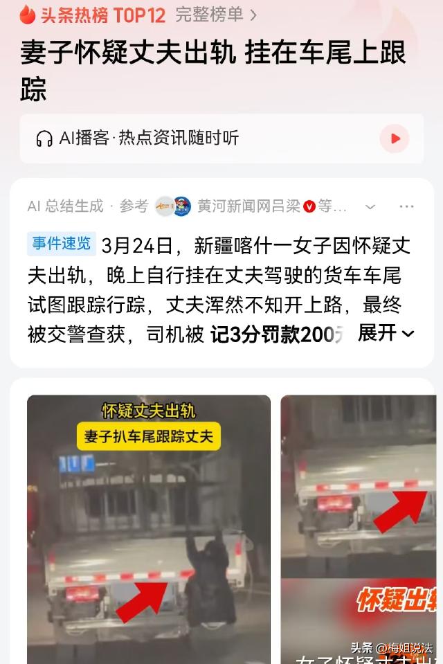 用生命捉奸!新疆喀什,女子怀疑丈夫有外遇,于是偷摸扒在丈夫的货车后面,准备看看他到底是不是和人约会去了,结果半路上被网友看到拍了下来,这事也就捅到了民警那里。可让人没想到的是,女子没啥事,丈夫却被处罚了,这是咋回事呢? 据、大象新闻报道,事情发生在3月24日晚上九点来钟。 当时,一个网友开车走在路上,车灯晃到前面的大货车,他突然看到货车后面好像挂着个什么东西,那个东西还会动,看着像个猴子。 可是新疆这地方,猴子也不常见呀?网友一时好奇心上来了,故意放慢速度跟在后面仔细看。 终于网友看清了,后面并不是什么猴子,而是一个活生生的人,还是一个女人。 一时之间网友大为惊奇,他实在搞不懂,这个女子明显是自己扒在货车后面的,她这么干是图什么?搭顺风车吗?于是他自己拍到的视频发在了网上。 结果一发出去引发了很多人围观,当地民警也注意到了这个事,并且成功找到了货车车主。 经过货车车主讲述,事情真相大白,起因却让人哭笑不得。 原来,司机是个开货车的,常年在外面跑车,在家时间比较少,时间一久,妻子就不满意了。 妻子觉得,别人家的男人出门回来,就想和老婆孩子腻乎腻乎,她的老公怎么和个和尚似的,回家就是睡觉玩手机?难不成在外面吃饱了? 妻子越想越觉得自己猜对了,在心里痛骂了丈夫千百遍,可是俗话说捉贼拿赃,捉奸拿双,她根本没证据。 妻子拉着丈夫质问他,丈夫被妻子整得非常无奈,没有影的事,让他怎么承认? 一来二去,夫妻俩吵了一架,妻子在心里更加认定了丈夫不忠。 于是,得知丈夫要出门,妻子提前扒在车后面,准备跟过去看看,丈夫是不是和人约会去了。 结果妻子这奇怪的举动正好被后面的车拍到,引起了当地交管部门的注意。 民警找到女子的丈夫后,询问他认不认识扒在他车后面的这个人。 丈夫无奈地回答:认识,这个人是我老婆。 民警也很好奇,问她为什么会挂在车后面,丈夫苦笑:她怀疑我。 民警顿时憋不住,噗嗤一声笑了。可笑归笑,丈夫还是因此被扣3分,罚款200元。 那么问题来了,明明是妻子做出危险举动,偷偷扒在车后面的,为什么受罚的却是她的老公呢?妻子这种做法是否违法? 依据《道路交通安全法》第二十二条规定:机动车驾驶人应当遵守道路交通安全法律、法规的规定,按照操作规范安全驾驶、文明驾驶。 丈夫作为驾驶人,应尽到安全驾驶义务,有责任在开车前对车辆及周边情况进行必要的检查,以保障行车安全。 根据《道路交通安全法》规定,司机要确保车辆符合安全行驶条件且不搭载危险人员。 可问题是,丈夫启动车辆前显然没有检查,以至于妻子扒在车后,处于极度危险状态,他都没有发现。 妻子这种行为严重影响了道路交通安全,而丈夫作为司机却没有发现阻止,属于未履行安全驾驶义务。 所以,最终民警依据相关法规,对丈夫作出扣3分、罚款200元的处罚。 这件事的始作俑者是妻子,妻子的这种做法是否违法呢? 从严格意义上来说,妻子扒在货车后面的行为违反了道路交通安全相关规定。 《道路交通安全法》明确禁止行人实施危害道路交通安全的行为。 妻子扒车的行为不仅对自己的生命安全造成了严重威胁,也给其他道路使用者带来了潜在的危险,这种行为扰乱了正常的交通秩序,具有一定的社会危害性。 可问题是,妻子的行为虽然不对,但现行法律并没有针对类似行为的处罚规定,所以妻子并不会受到丈夫那样的行政处罚,但批评教育肯定是免不了的。 妻子怀疑丈夫出轨 挂在车尾上跟踪
