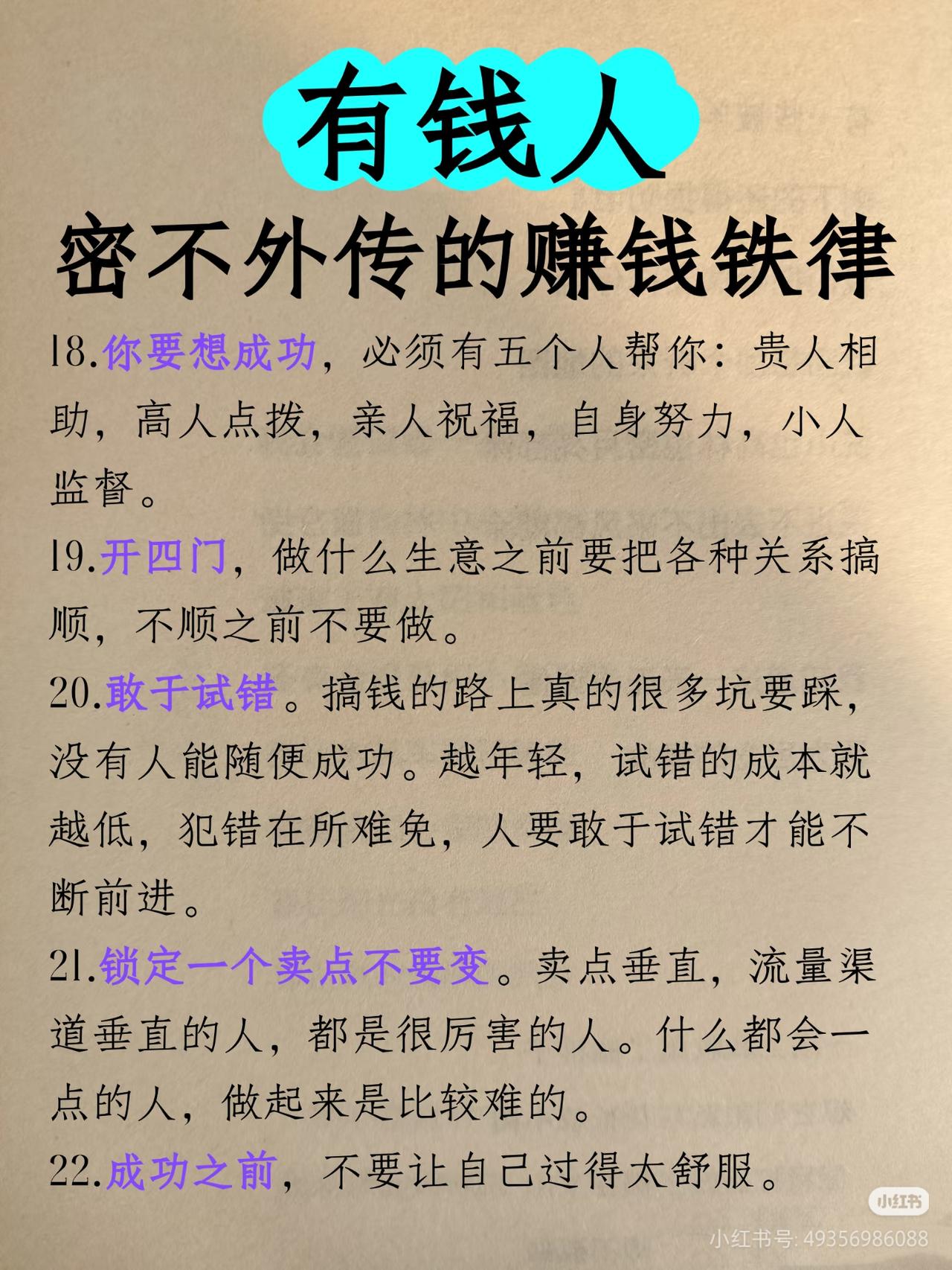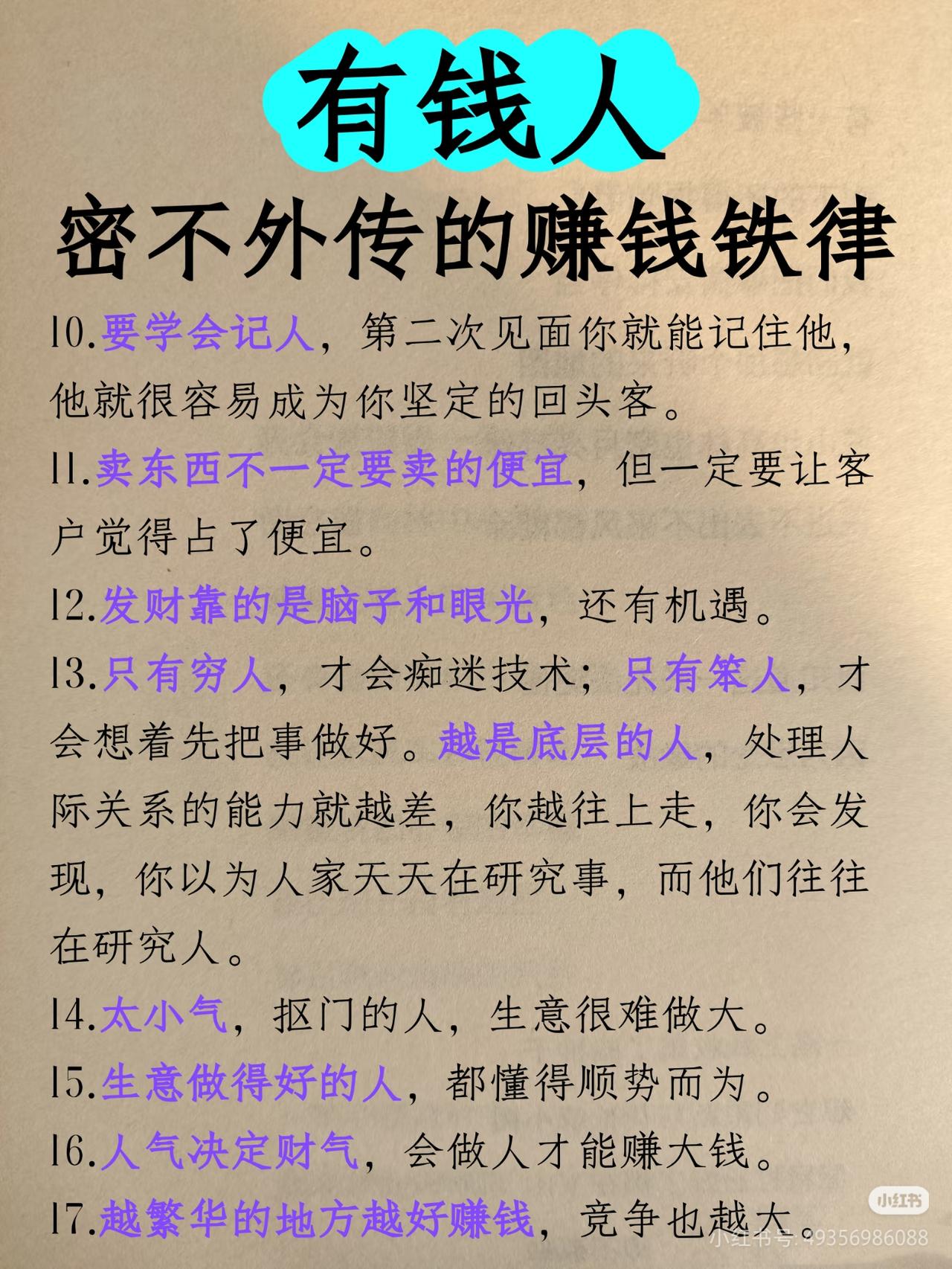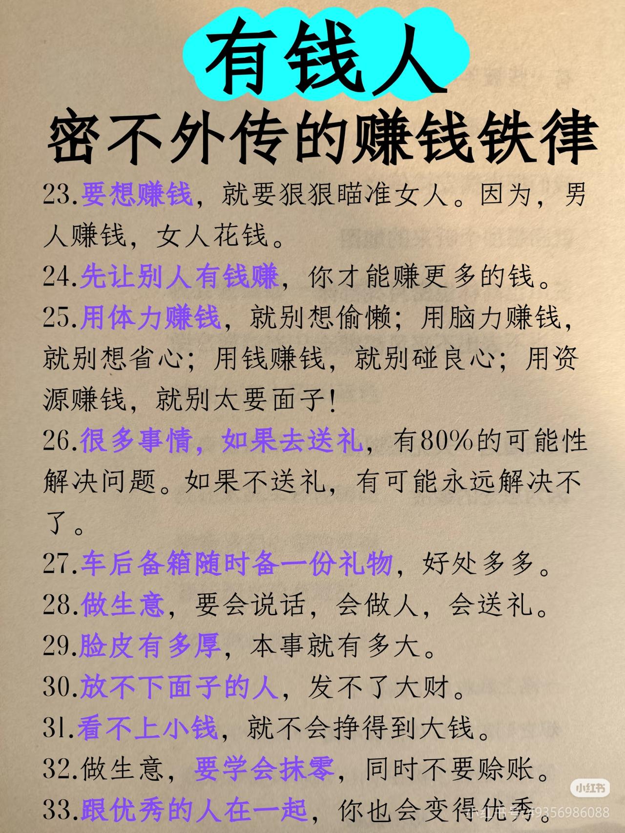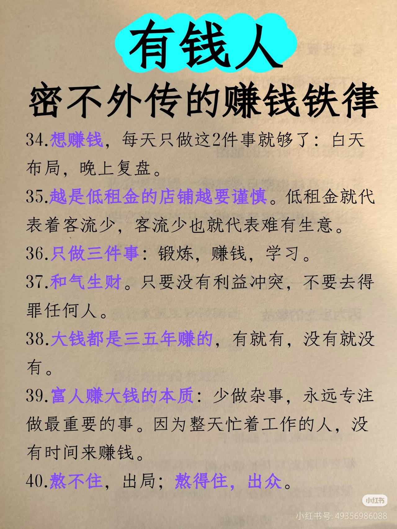 有钱人密不外传的40条赚钱铁律!建议收藏,反复看! 很多人一辈子穷,不是没能力,是没搞懂赚钱的底层逻辑! 这40条有钱人秘而不宣的赚钱铁律,从思维、人脉、生意、心态全给你讲透,看懂的都悄悄变富了: ✅ 普通人盯紧黄金:金价跌=经济景气,大胆投资;金价涨=经济恶化,谨慎投资 ✅ 富人赚大钱的本质:少做杂事,永远专注做最重要的事 ✅ 想赚钱,每天只做2件事:白天布局,晚上复盘 ✅ 熬不住,出局;熬得住,出众 ✅ 先让别人有钱赚,你才能赚更多的钱 ✅ 大钱都是三五年赚的,有就有,没有就没 ✅ 放不下面子的人,发不了大财 ✅ 跟优秀的人在一起,你也会变优秀 赚钱拼的从来不是蛮力,是思维、是认知、是格局! 建议收藏,每天读一遍,慢慢吃透,财富自然会向你靠拢! 搞钱 赚钱思维 富人思维 认知