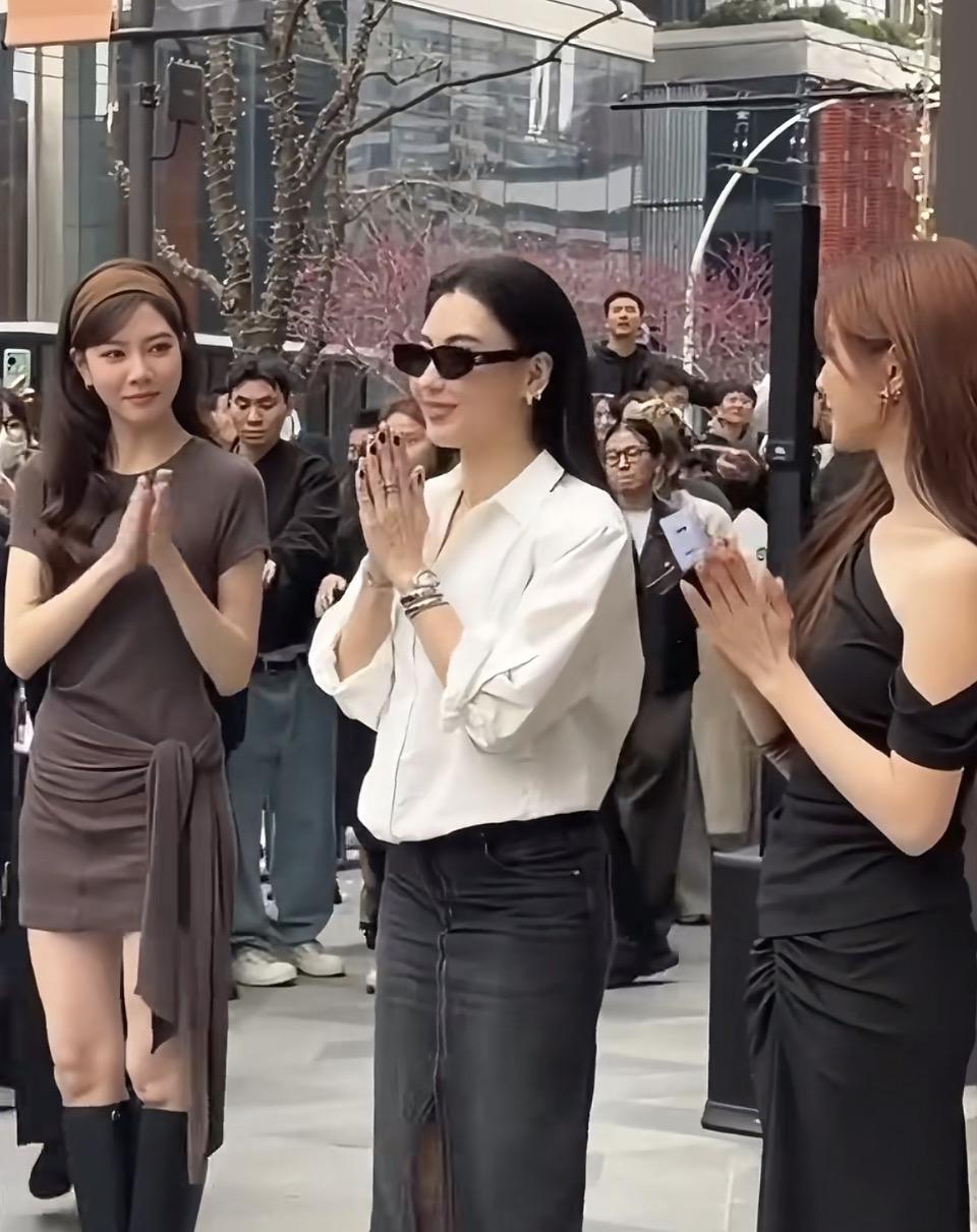 春日花影里,香槟杯轻碰出细碎的光✨ 白衬衫与黑裙的碰撞,是岁月沉淀的从容,也是新