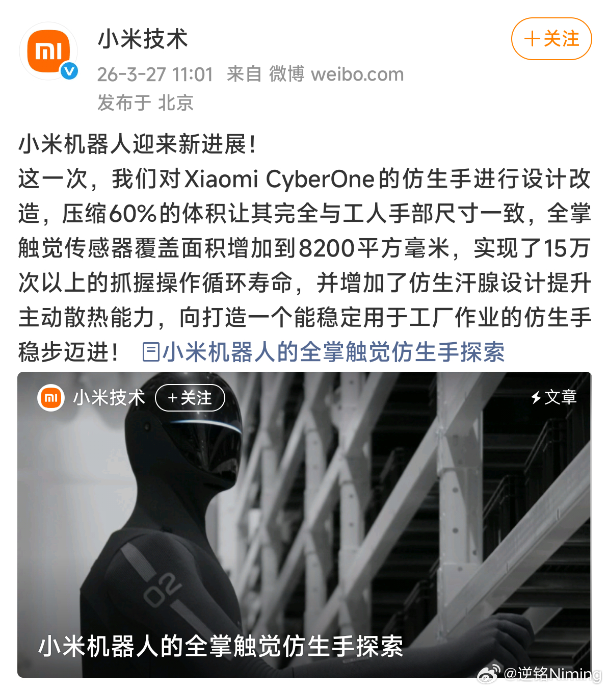 小米技术公开了一份新的仿生手技术方案,大大增加了触觉传感器面积和抓握操作寿命。