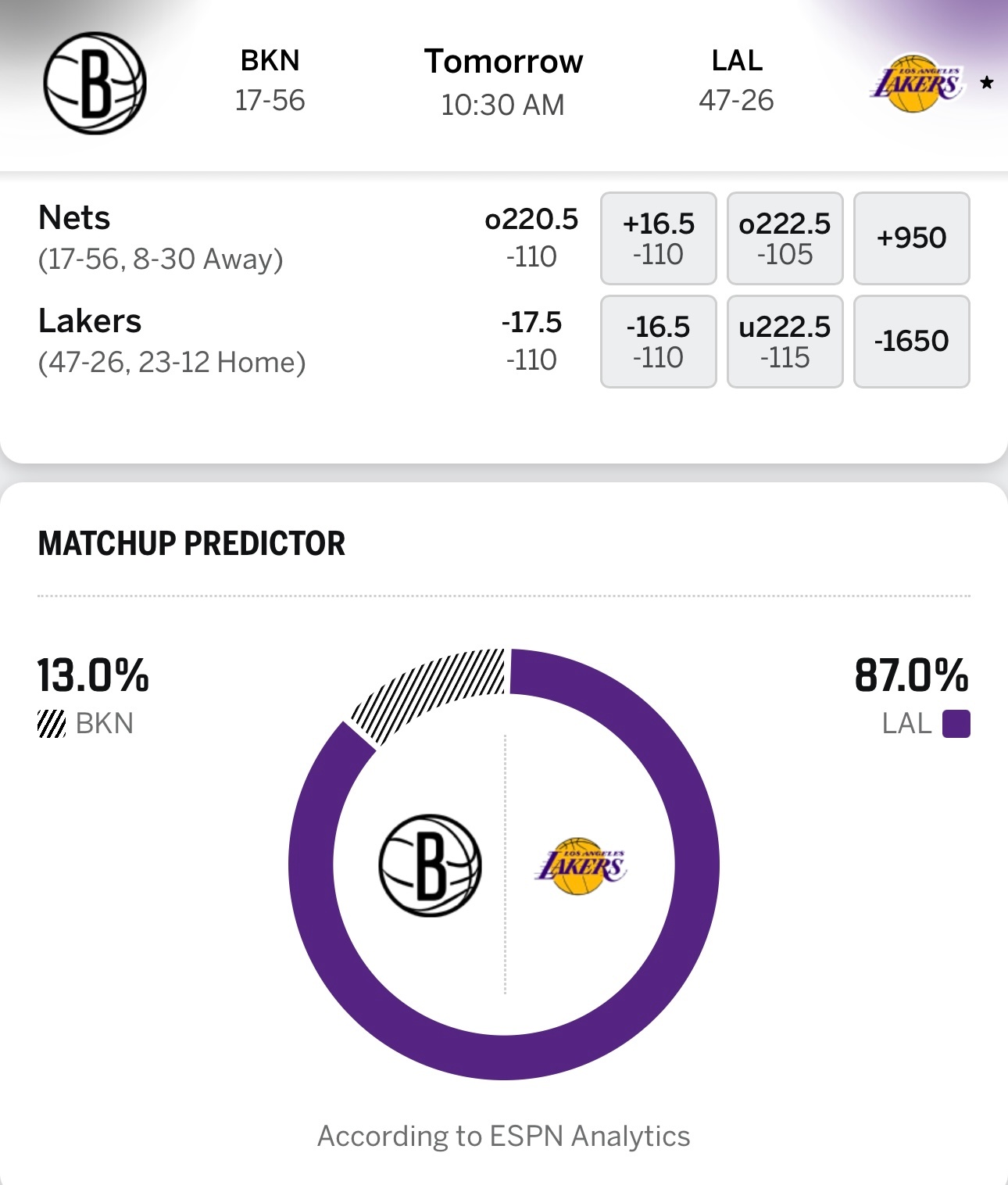 明天10点半,湖人主场对阵篮网!东契奇、八村垒出战成疑,斯玛特缺阵。本赛季首回合交锋,湖人客场取胜。ESPN预测胜率,湖人87%一边儿倒。希望能三节打卡,让核心球员多休息。
