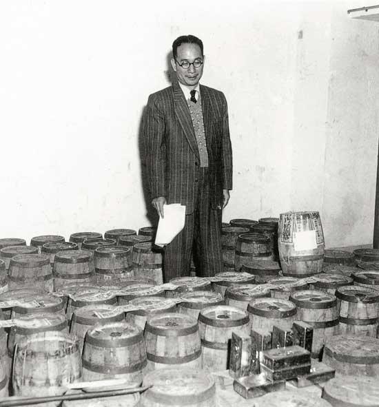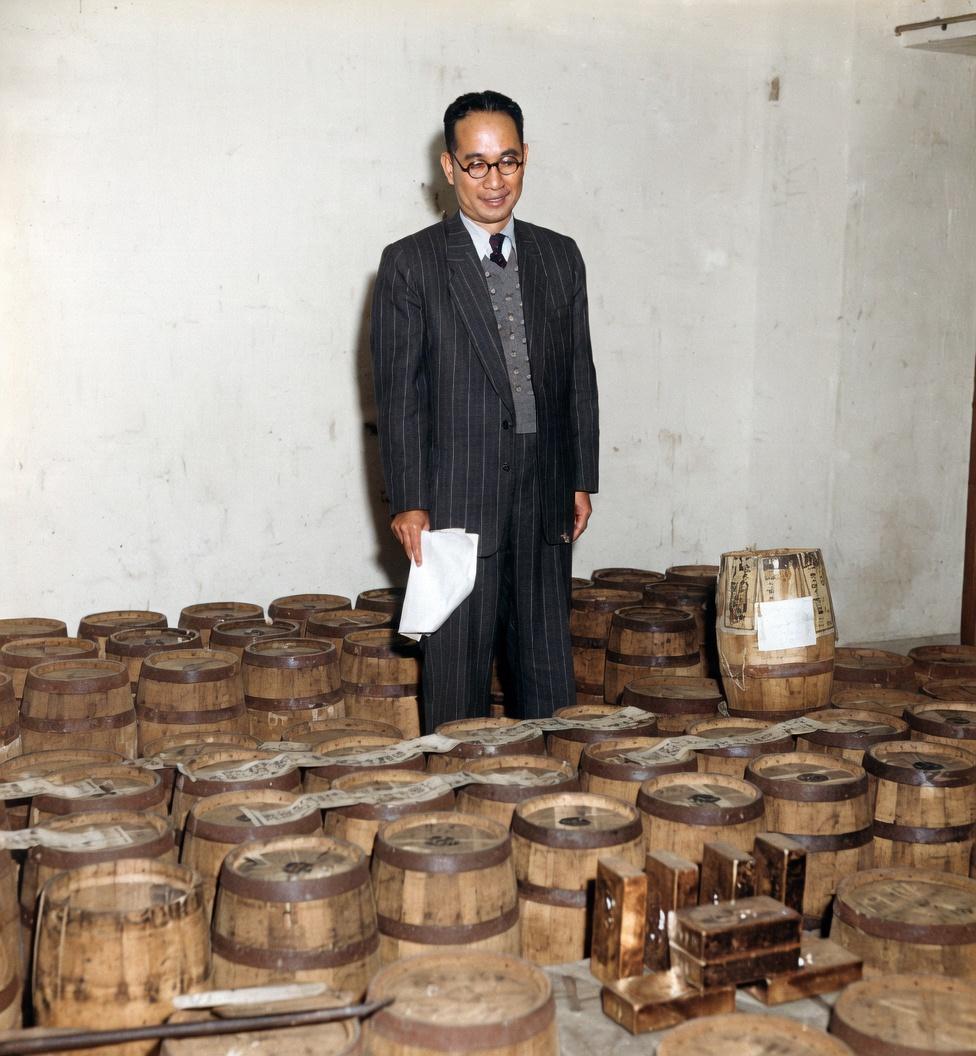 1949年国民党政权将大陆黄金秘运台湾,这张照片是中人物是当时负责黄金押运与保管的官员。 地面上密密麻麻的木桶,外观酷似威士忌酒桶,实则是用来伪装装运黄金的容器。桶身贴有封条,部分标注“金圆券准备金”字样,证实这些是从大陆中央银行金库运出的国库黄金。旁边的方形木箱则用来装载金砖,主要是抗战后美国援助的军费黄金。 这位身着条纹西装、手持文件的官员,正是这批黄金运抵台湾后,负责清点与入库的管理者,他站在黄金堆前的留影,成为这段历史的直接视觉证据。用酒桶伪装黄金,是为了在战乱中掩人耳目,避免运输途中被截获或引起外界注意,是国民党“密运黄金”计划的关键手段。 1948年底至1949年初,国民党在大陆战场节节败退,蒋介石下令将国库黄金分批秘密运往台湾,前后共运出约450万至700万两黄金(约合当时3250亿新台币),分7次从上海、厦门等地起运。 这批黄金是当时中国的核心金融储备,被运到台湾后,成为国民党维持台湾经济、发行新台币的基础,也彻底掏空了大陆的金融根基,加剧了新中国成立初期的经济困难。