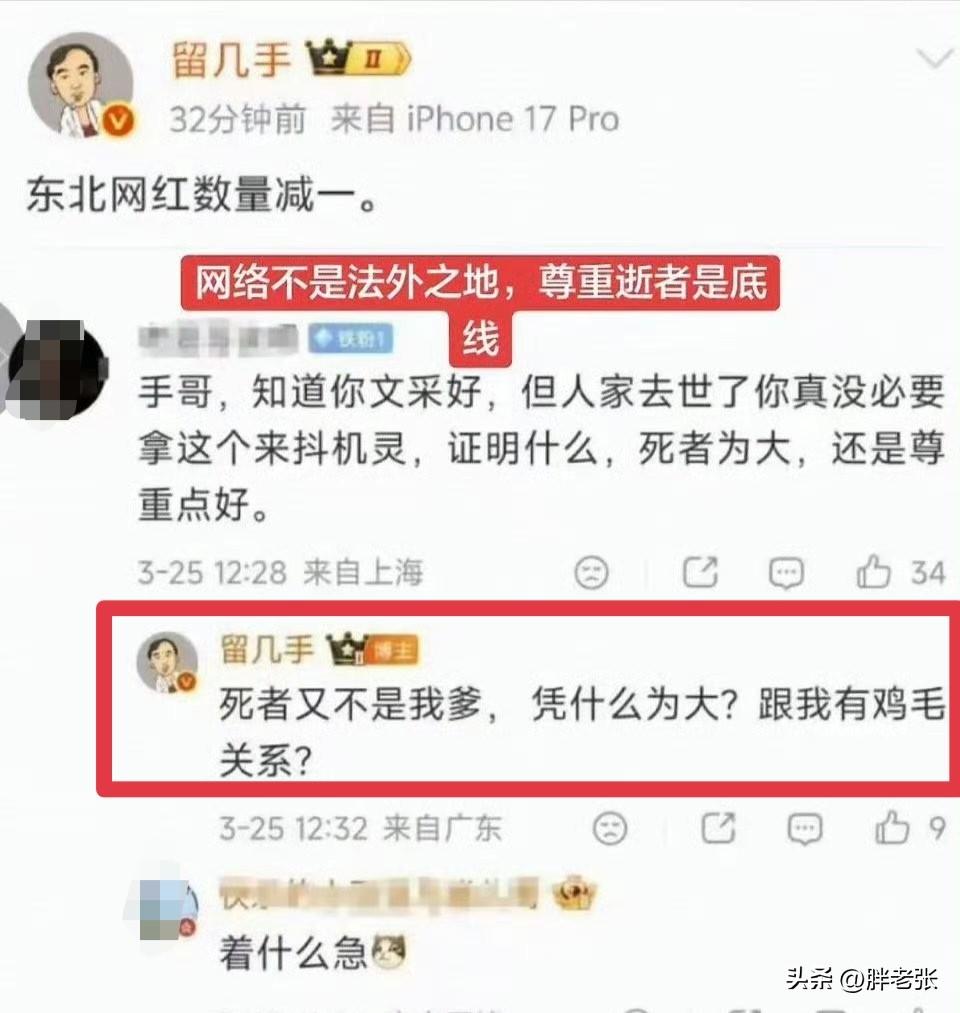 这么多粉丝的大手子,不应该犯这种低级错误吧! 将近一千三百万粉丝的大V啊,因为自己的言行,被禁止关注了!这就是脚下的泡都是自己走出来的! “东北网红数量减一”这样的虎狼之词怎么好意思说出来? 还有他面对网友"死者为大"的提醒,竟然回怼:"死者又不是我爹,凭什么为大?跟我有鸡毛关系",甚至辱骂网友"玩你妈就行了"! 这样的不良言行真的应该给他封了,不冤! 网络真的不是法外之地,不要信可开河,别给自己带来麻烦!