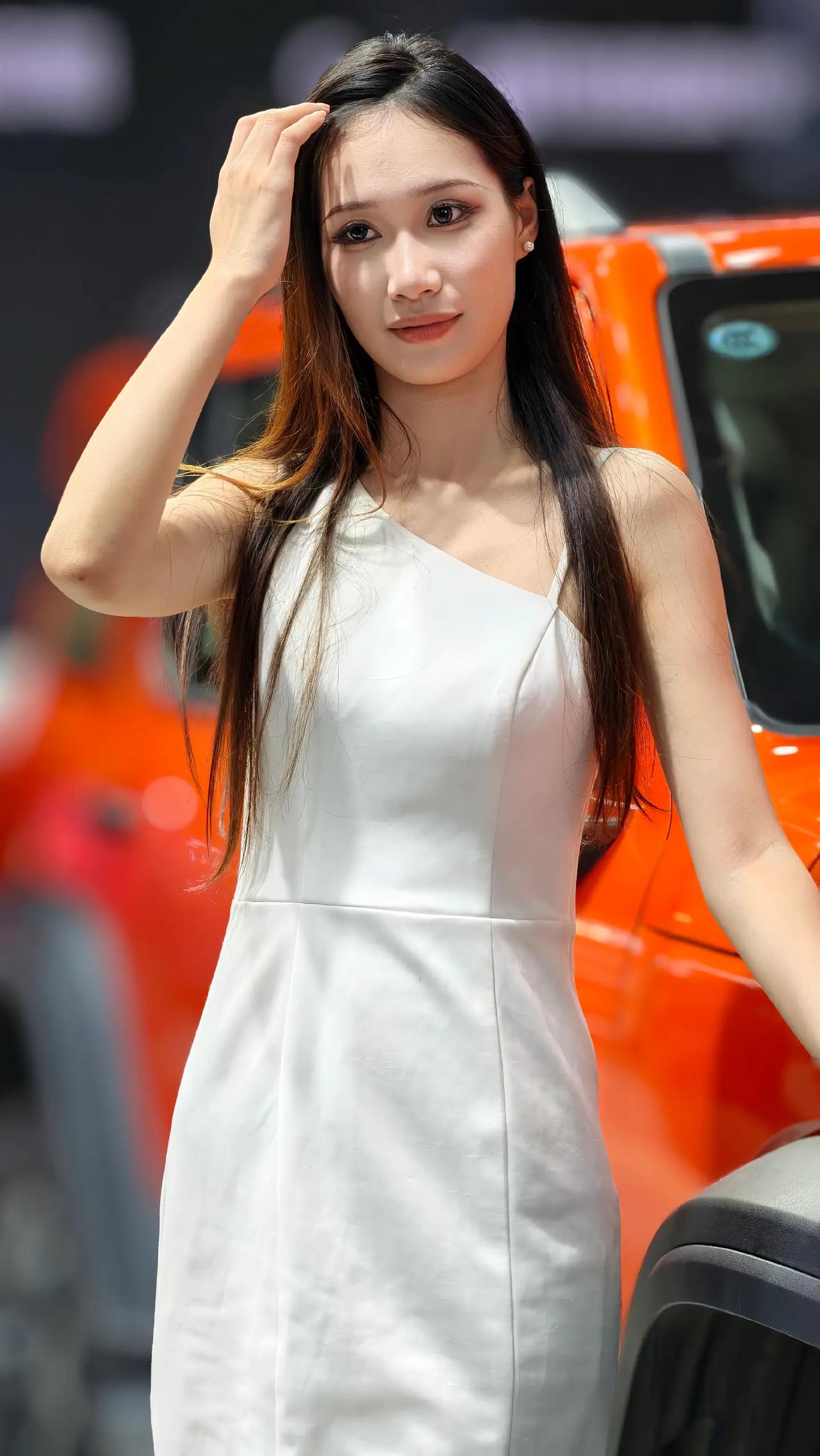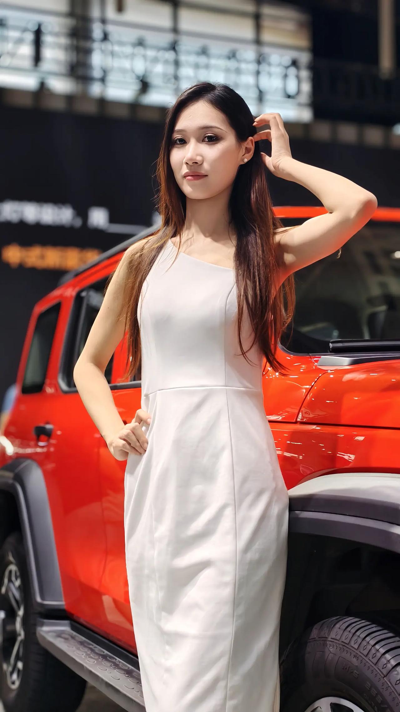 这位美女穿着白色连衣裙,站在橙色车旁。美女车模小姐姐。