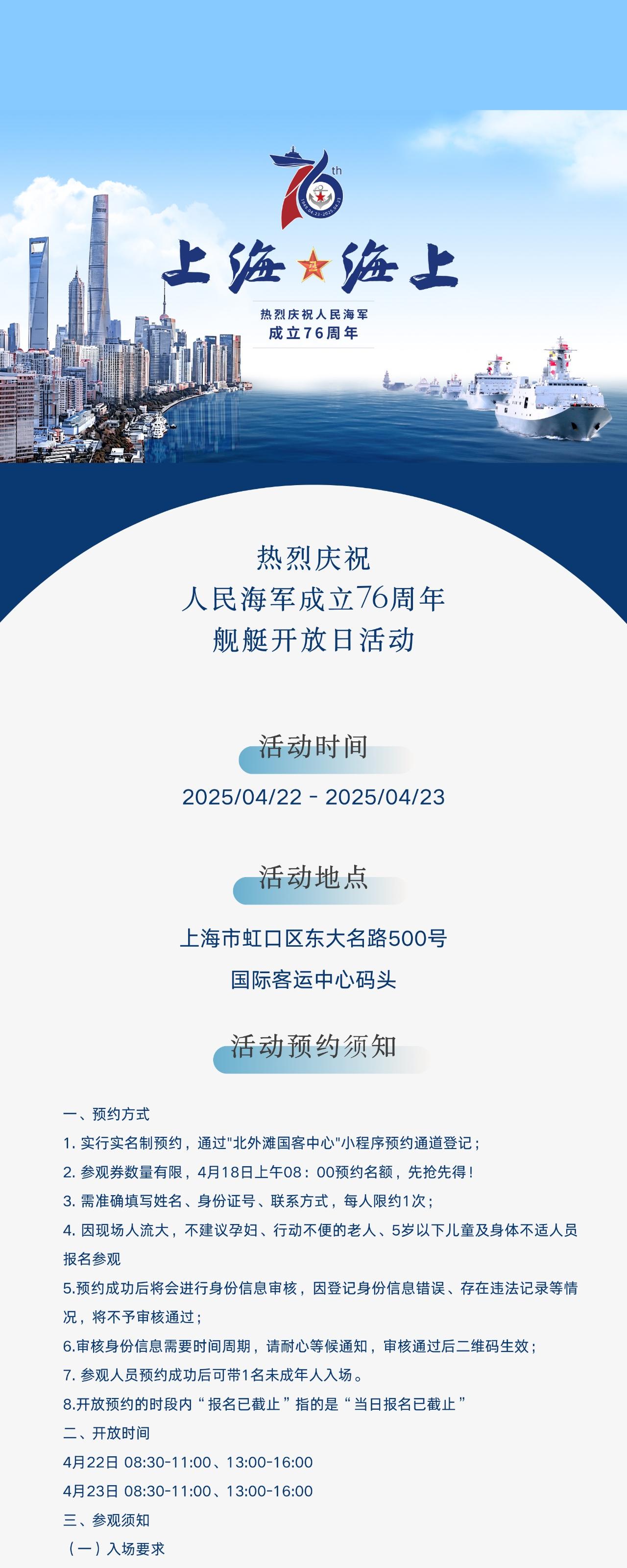 每年一度的海军开放日来了,今年4月23日是中国人民解放军海军成立77周年,而如果在上海,跟去年一样则可以预约报名海军舰艇开放日参观。 本次参观全部实行线上预约,不接受现场报名。预约通过微信小程序“北外滩国客中心”进行,预约时间为4月18日上午8点,参观地点在上海市虹口区东大名路 500 号北外滩国际客运中心码头。 曾在2014年5月有幸参观过一次海军052C中华神盾郑州舰和俄国光荣级巡洋舰瓦良格号的共同展示,俄舰皮实厚重,堆满天线武备,很多地方的油漆为了盖住锈渍刷得很厚,与中国崭新的052C神盾干净简洁风格完全不同,那个时候就觉得俄国的主力舰已经完全比不上中国了。 预约名额有限,据说前几次预约都是秒空,但不管怎么样,还是定好闹钟去试试吧。