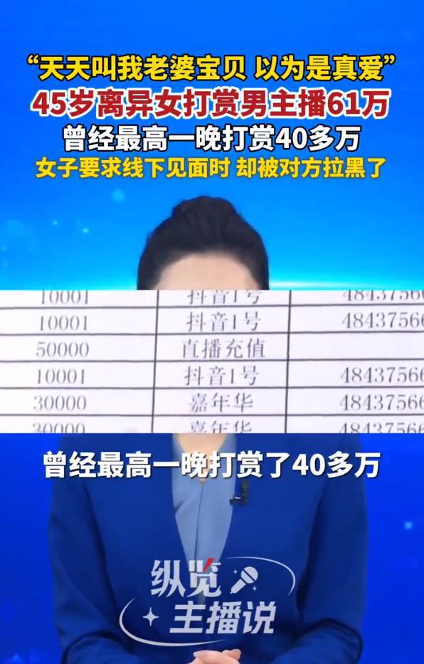 真有这么傻的人!一声老婆四十五岁离异女打赏男主播六十万 四川一位45岁的离异大姐,就因为男主播天天喊她老婆、宝贝,几句甜言蜜语就彻底陷进去了。为了男主播冲榜,前前后后打赏了61万,有一晚就刷了40多万。 结果一提出见面,直接被对方拉黑,人财两空。我是真不理解,是什么样的人,会给一个看不见摸不着的主播打赏真金白银。看的出来,这姐姐过于缺爱了! 太缺爱了以至于别人说两句好听的话就当成真爱,把虚拟的甜言蜜语当真,钱砸进去连个响都听不到,也是实惨。