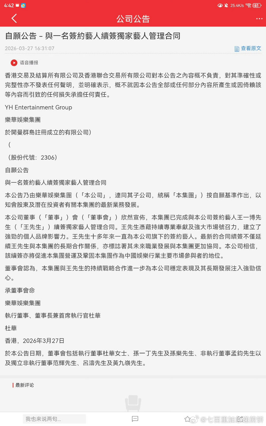 用户10xxx37 1 2026-03-28 03:04 严格意义上,王一博不叫续约,而是某种意义上的和乐华合作。过去,一博是乐华娱乐的签约艺人,由公司直接管理分配资源收入,是艺人合约分成。现在他是以服务供应商的身份,和乐华合作,相当于乐华向他采购演艺服务。双方是商业合作关系,也就是王一博以后的商业自主权会更大,不再是传统的经济从属关系。目前看王一博续约改名后,粉丝不但未减倒是涨了不少。
