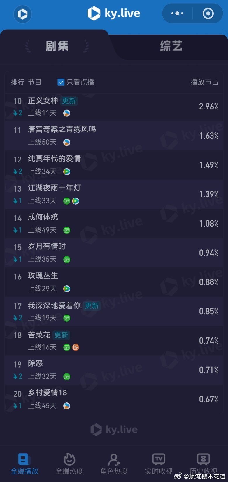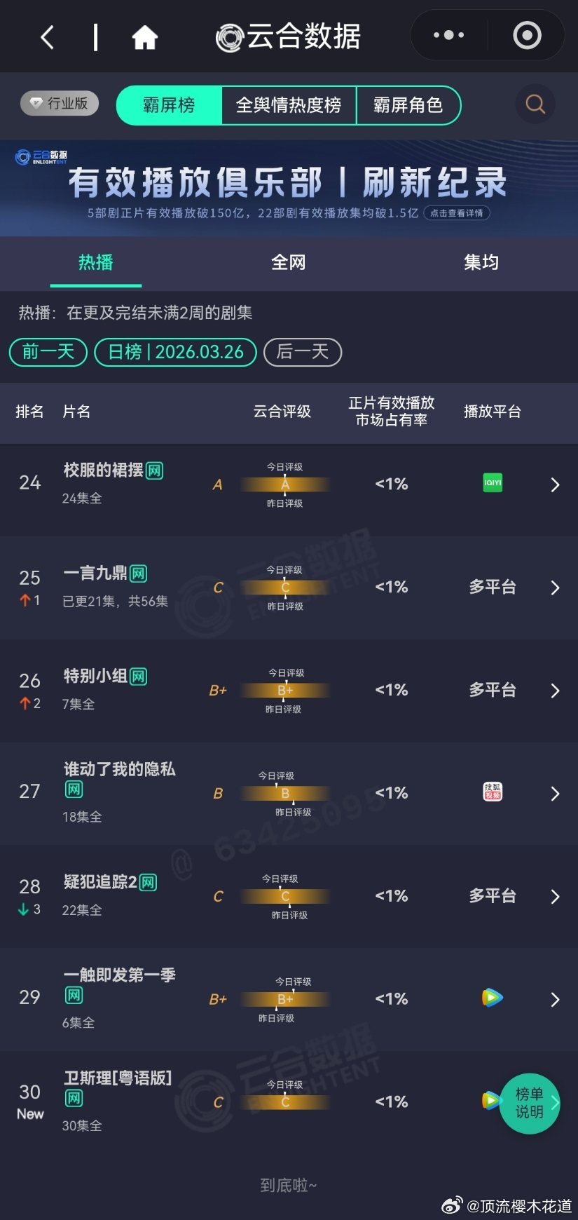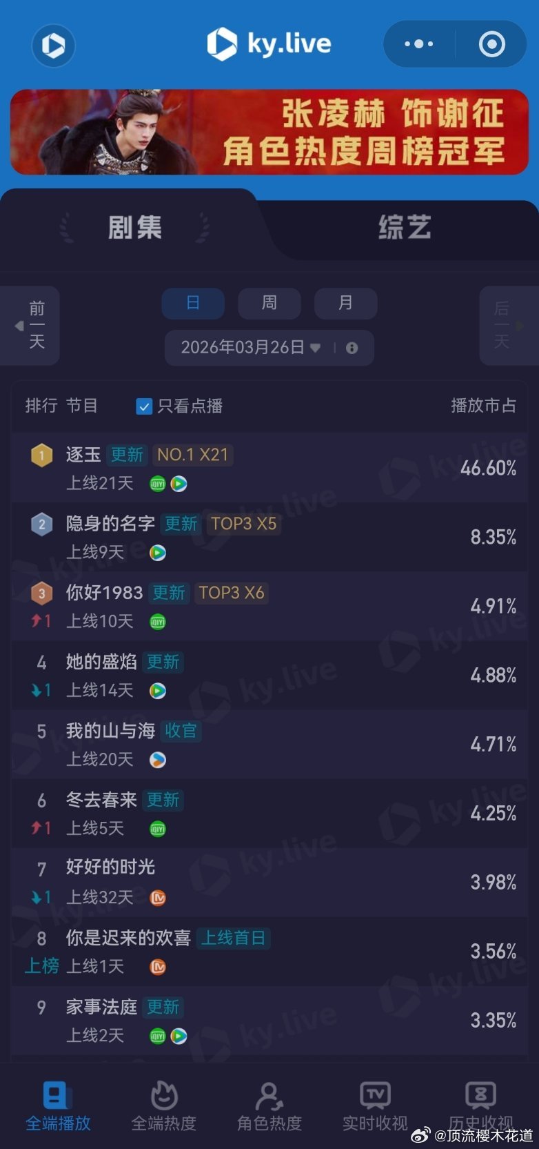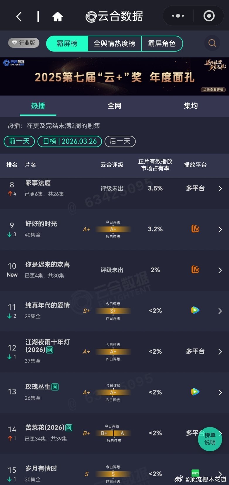 2026年3月27日云合播放占比云合 VS酷云逐玉云合48.7%,酷云46.6%家事法庭云合3.5%,酷云3.35%你是迟来的欢喜云合<2%,酷云3.56%