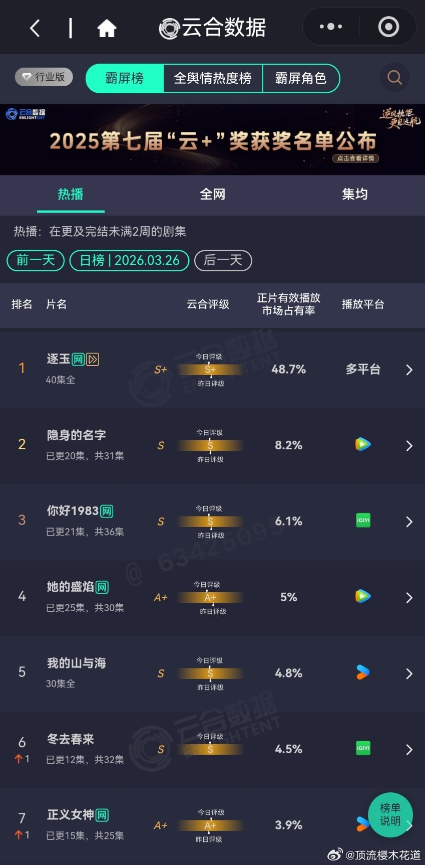 2026年3月27日云合播放占比云合 VS酷云逐玉云合48.7%,酷云46.6%