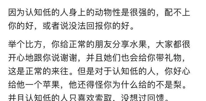 你以为离开大城市就能轻松点,其实回到县城,一个月生气的次数可能更多。脾气好的人,往往在小地方处处受气,别人不仅不感激你,反而觉得你好欺负。帮助别人越多,收获的并不是回馈,可能只会被当成理所当然。低认知的人不懂感恩,认为索取是天经地义,你给再多也换不来一点回报,甚至还可能被他们嘲讽。 遇到这样的人,哪怕你是律师或医生,正常收费和救助都能被曲解成“拿了他们的面子”。刚认识还觉得对方单纯可爱,时间一长才发现那些所谓的“傻”,其实是一种冷漠和自私。过度善良,只会助长他人的恶念,让自己变成受伤的那一个。 真正的善良不是无底线的退让,也不是任人拿捏。做人要有自己的原则和锋芒,才不会被消耗得一干二净。善良需要有点姿态,别让“软”变成被欺负的理由。