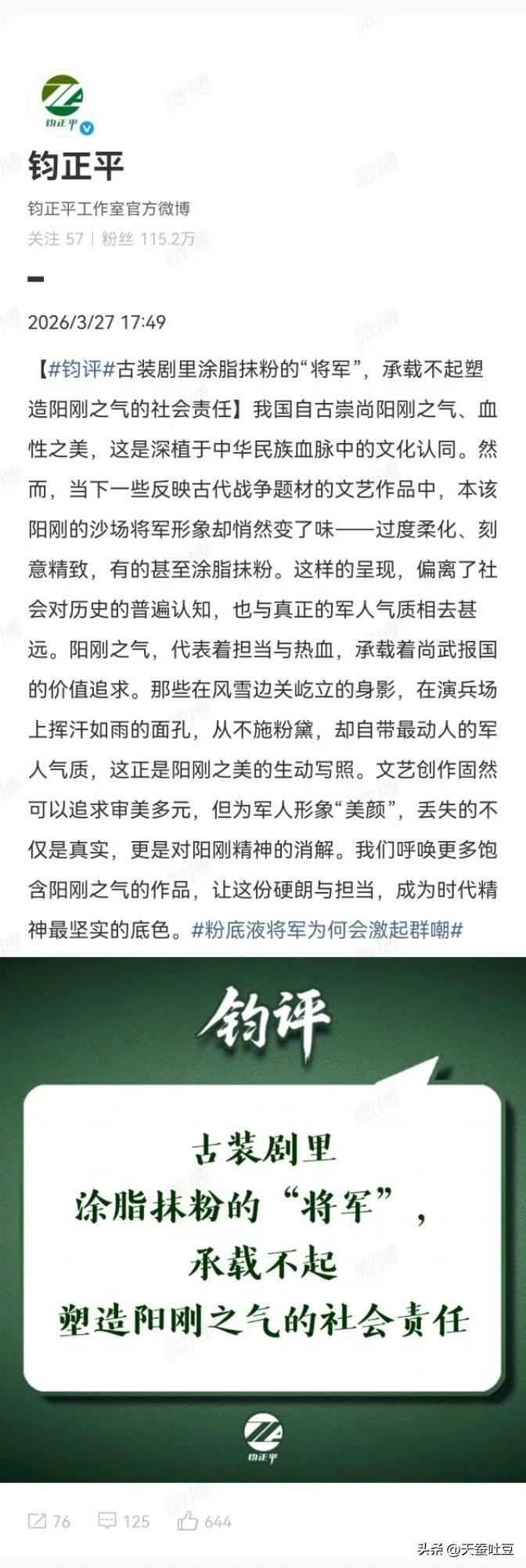 钧正平:古装剧里“涂脂抹粉”的将军,承载不起塑造阳刚之气的社会责任。 ➤古装剧