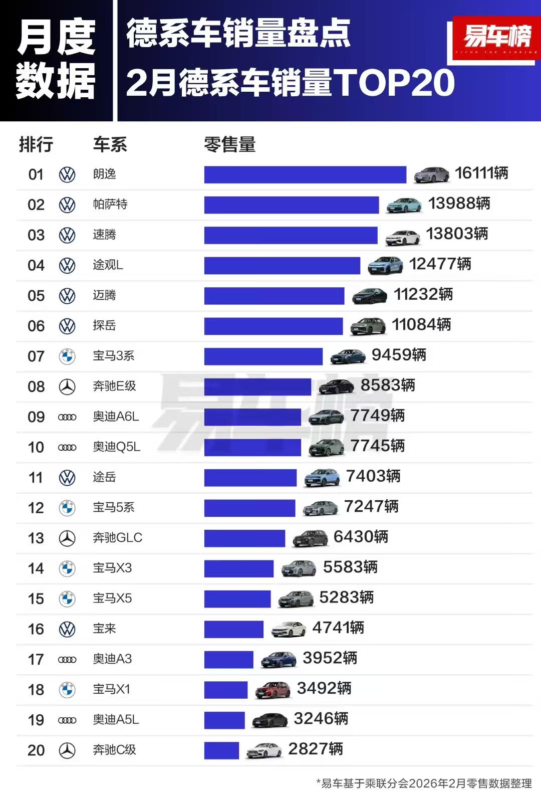 德系车的“铁饭碗”,还能端多久? 2月销量榜出来了,朗逸、帕萨特、速腾又是德系前三,看着挺稳的。但仔细看数据,其实有点意思——朗逸卖了1.6万辆,放在几年前这数字根本不够看。更扎心的是,排名第20的奔驰C级只剩下2827辆,同比跌了快一半。 这背后其实就一个问题:德系车还在吃老本,但老本快吃完了。燃油车的基本盘确实还在,一汽-大众2月还能卖9.8万辆,靠的就是速腾、宝来这些老面孔撑场面。但问题是,新能源渗透率都冲到44.9%了,德系这边能打的电车有几个? 再看BBA那边,虽然嘴上都说“2026年是转型关键年”,但看销量就知道——奥迪A6L同比跌了45%,宝马5系要不是降价狠,估计也扛不住。现在的消费者没那么好糊弄了,智能座舱、智驾这些东西跟不上,光靠车标真不好使了。 不是说德系不行了,而是“德系=高级”这个公式正在失效。哪天榜单前十里新能源车占了一半,那才是真正变天的时候。【来自懂车帝车友圈】