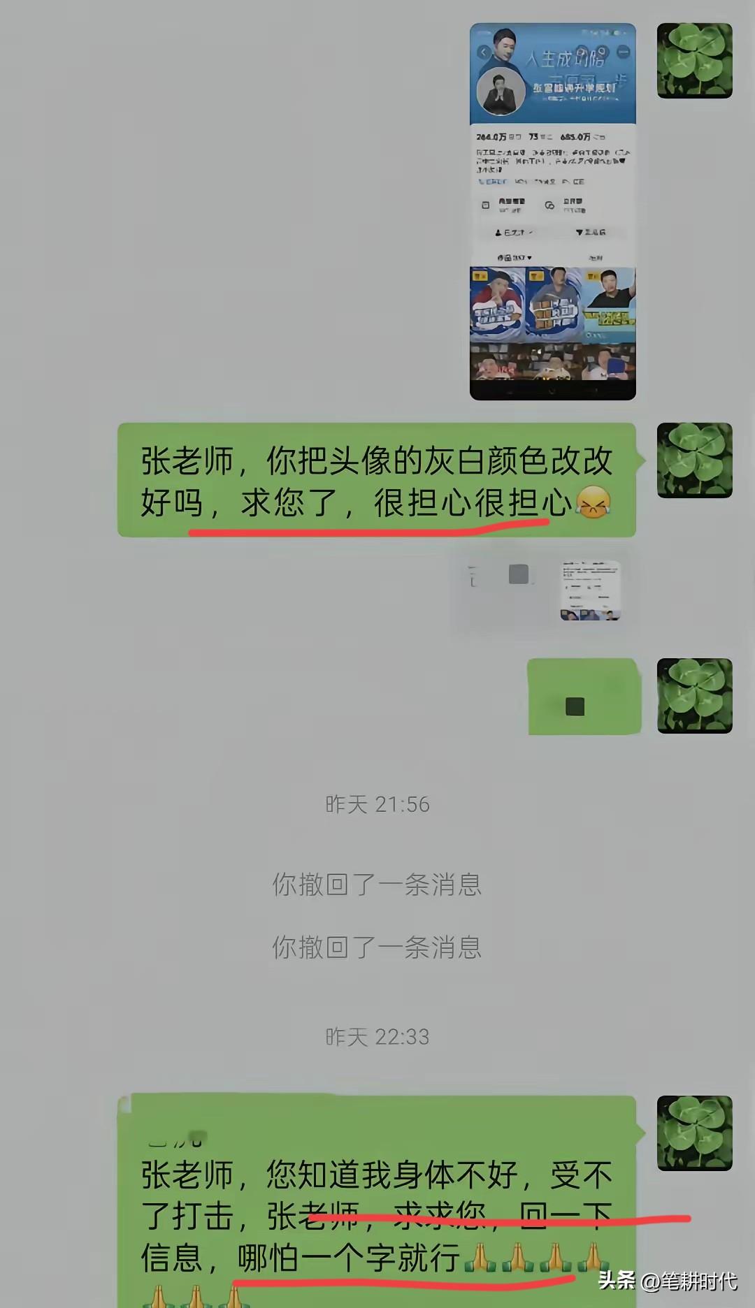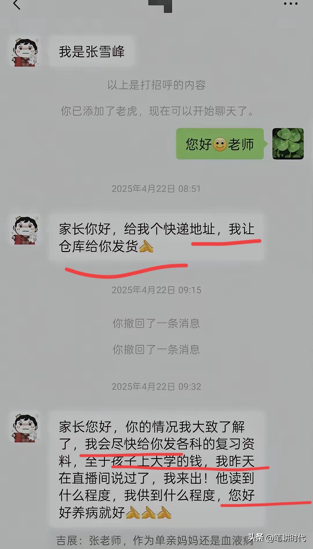 看这个对话哭得不行!一位妈妈晒出与张雪峰的聊天记录,当张雪峰的头像变成了灰白,她慌了!一遍遍发消息求他改回来,哪怕只回一个字。 这位妈妈是血液病患者,独自带着高二的孩子,孩子成绩从重点高中前200掉到了400名,没钱补课,她试着联系了张雪峰。 张雪峰听到这位家长有困难,承诺会提供帮助。 看家长晒出的截图,没想到是张雪峰主动添加家长的联系方式,要了地址寄了复习资,还说:“孩子上大学的钱,我来出!” 甚至转了5000块让她买营养品,一句东北话“别撕吧”蕴含着满满的真诚。 我看过这个直播,张雪峰的大恩情让人感动,不是父母更似父母。无私帮助太让人敬佩了。 哪怕不花钱买服务,多听听直播切片也基本知道怎么选专业了,对很多家长来说也是未曾谋面,深受其恩。 张雪峰自己从寒门一步步实现了阶层跃升,但他没有关闭他发现的这道门,而且他搭了一个阶层跃升的通道,帮助更多的寒门学子实现阶层跃升的梦。这才是普通老百姓怀念他的原因。
