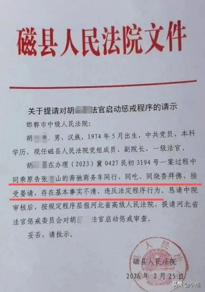 3月27号,邯郸中院发了个通报,磁县法院副院长胡某某被免职了。 起因是一份法院内部文件在网上传开了。文件里写得明明白白:这位副院长办一个案子的时候,跟原告坐同一辆奔驰商务车,一起吃饭,还一起去庙里烧香拜佛。 发帖的是被告李某。他说自己已经投诉了整整3年,实在是没别的办法了。 李某是那个案子的被告。原告张某山起诉他还90万借款,一审法院判他败诉,要还这90万。 他不服,开始举报胡某某。 举报之后发生的事,比电影还魔幻。胡某某反过来告李某敲诈勒索,李某被刑事拘留了3天。 一个法官,被人举报了,转头就把举报人送进去关了3天。 李某说,前两天警方告诉他,敲诈勒索那个案子已经终止调查了。 而那个让他输掉90万的案子,后来被上级法院查出了问题。2025年11月,邯郸中院直接撤销了原一二审的判决,理由是“债权转让事实不清”,案子发回磁县法院重审。 这就有点意思了。一审判决是胡某某判的,二审维持了原判,结果上级法院说事实不清,全推翻重来。 所以当初判李某输,是在什么情况下判的?是在胡某某坐着原告的奔驰车去拜佛之后判的。 纪委查了这件事。调取了两人的行动轨迹,查实了李某举报的问题。2025年4月,市纪委给了胡某某党内警告处分。 但有意思的是,处分给了之后,胡某某还在副院长的位子上待了将近一年。直到2026年3月27号,媒体把这事捅出来之后,才启动免职程序。 记者打电话问胡某某,他说了句什么?他说“我不知道这件事,你通过组织询问,行吗?我们有纪律。” 一个副院长,被自己法院出的文件实名举报,他说不知道。然后让记者去问组织。 李某说,那份网传的文件是2026年2月25日磁县法院自己出的,叫《关于提请对胡某法官启动惩戒程序的请示》。文件里写得很清楚:胡某某同乘原告奔驰车、同行、同吃、同烧香拜佛、接受宴请,存在基本事实不清、违反法定程序。 这份文件出来之后,按程序应该层报邯郸中院,再报河北省高院,最后提请省法官惩戒委员会审查。 但李某说,他觉得文件出来之后就没下文了。他本来不想发到网上,结果胡某某告他敲诈勒索,他被拘留了3天。这才把文件发了出来。 3年。一个被告,要花3年时间,才能让一个跟原告一起烧香拜佛的法官被免职。 这中间要不是有那份内部文件流出来,要不是有媒体跟进报道,这事会不会就这么过去了? 纪委处分了,但人还在位子上。案子重审了,但之前的判决已经生效了快两年。 李某说他那个重审的案子,到现在还没出结果。 一个案子,原告和法官坐同一辆车去烧香拜佛,被告被拘留了3天,法官要被免职了,案子被上级法院推翻了。 现在的问题是,那个90万的判决,当初到底是怎么判出来的? 有人说,法官也是人,吃顿饭怎么了?但《法官法》写得明明白白,法官不得私自会见当事人,不得接受宴请或参加由其支付费用的活动。这不是什么高要求,这是底线。一个法官,连这都做不到,坐在审判席上的时候,被告心里能服吗? 更别说还一起去烧香拜佛。一个党员干部,搞封建迷信活动,这本身就违反党纪。 李某说他从2023年11月就开始举报,3年时间,中间被反告敲诈勒索被拘留了3天。现在案子重审了,法官要被免职了,他的刑事案子也撤了。 他问了一句:如果我没有把那份文件发到网上,这件事是不是就这么算了? 你觉得,一个法官跟原告一起去旅游、一起去拜佛,这个案子还能判得公正吗? (信息来源:邯郸市中级人民法院官方通报、华商报大风新闻、央视网)
