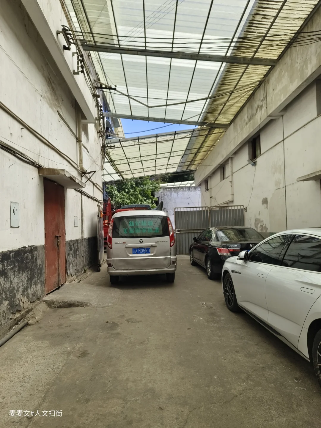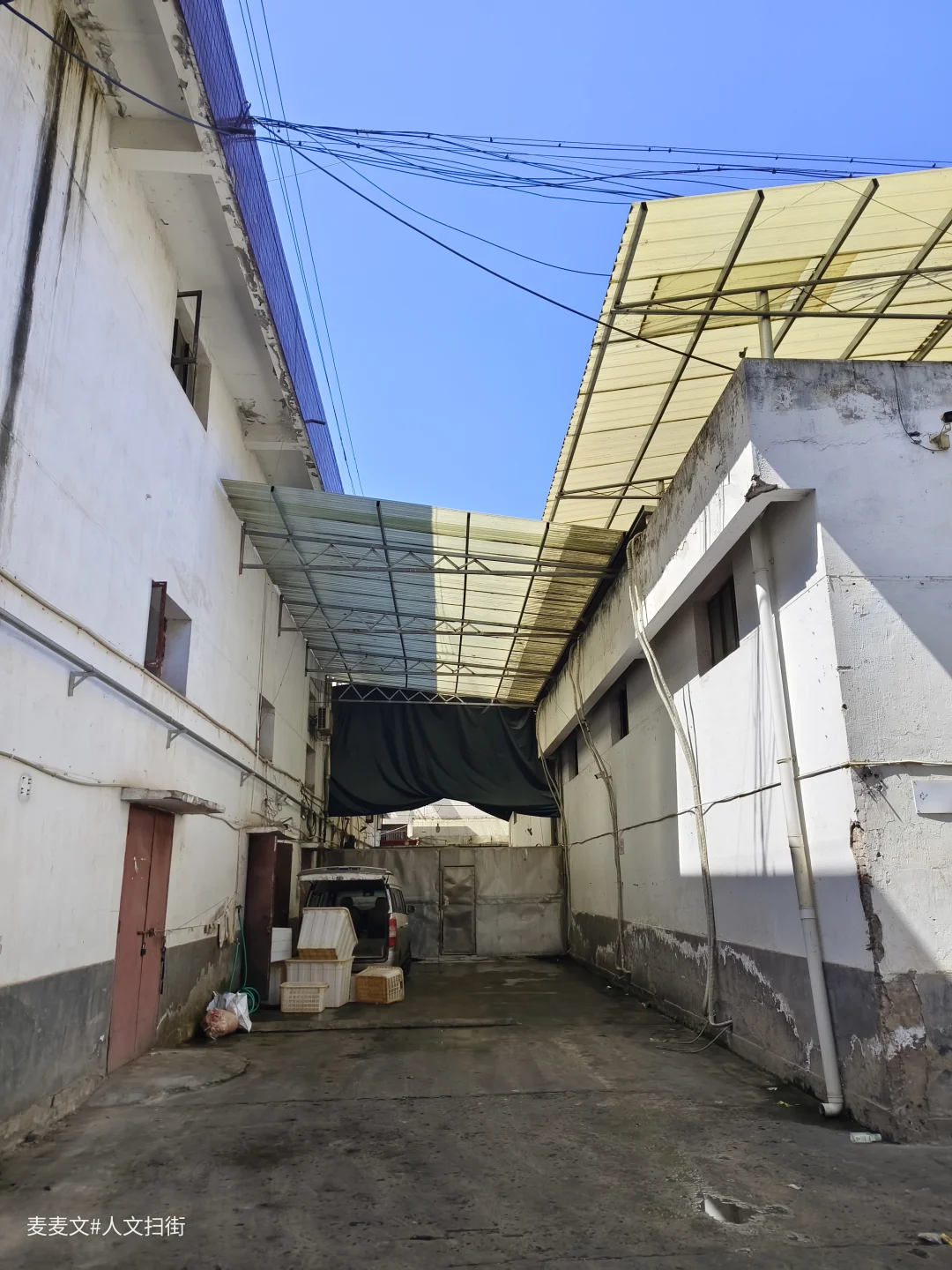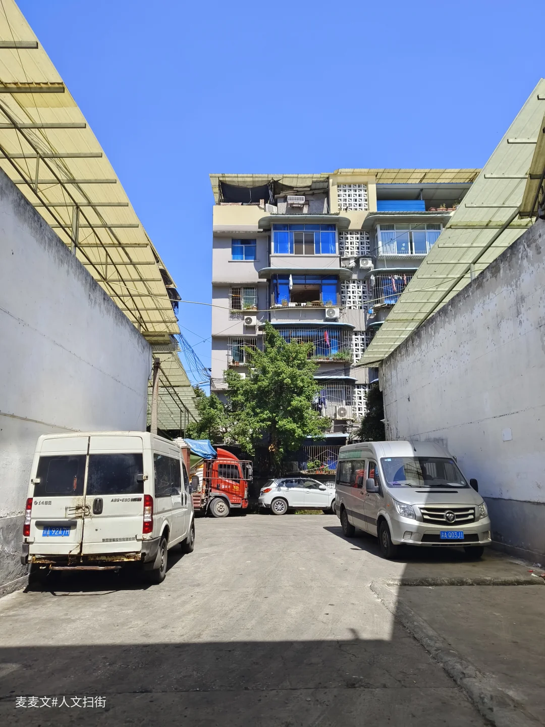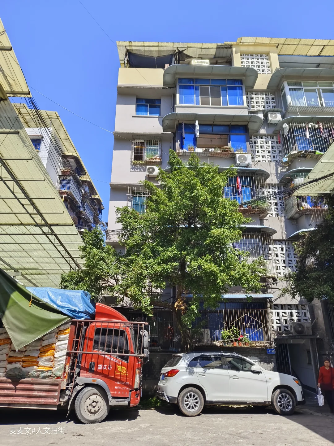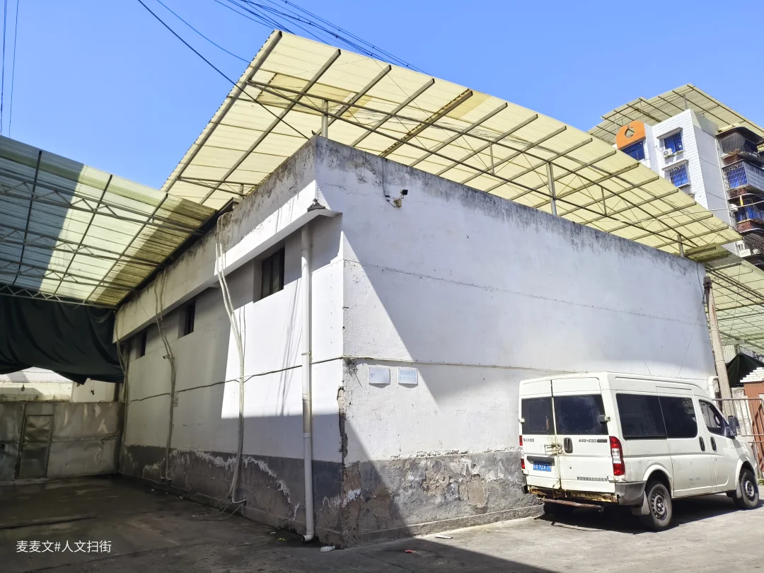 院内的老建筑爬满岁月痕迹,裸露的管线、掉皮的墙面,都在诉说着数十年的故事。仓库内的“渝北区学校粮食配送中心”还在运作,货车与私家车停满院落,老家属院的窗户里飘出生活气息,晾晒的衣物、盆栽的绿植,让这片工业旧址充满了人间烟火。