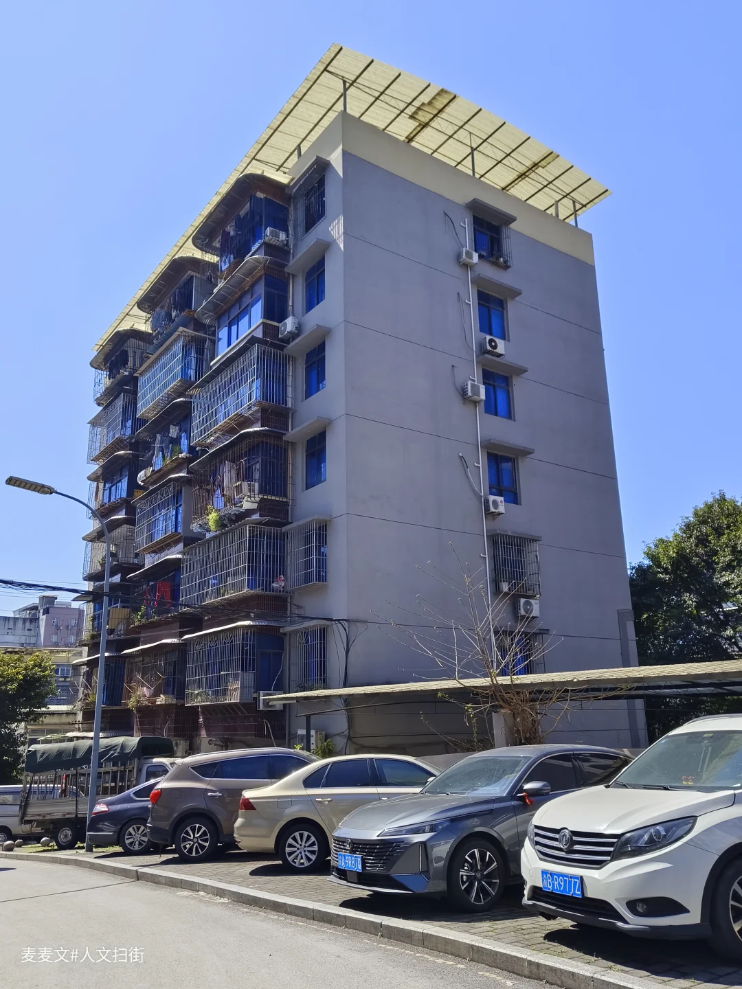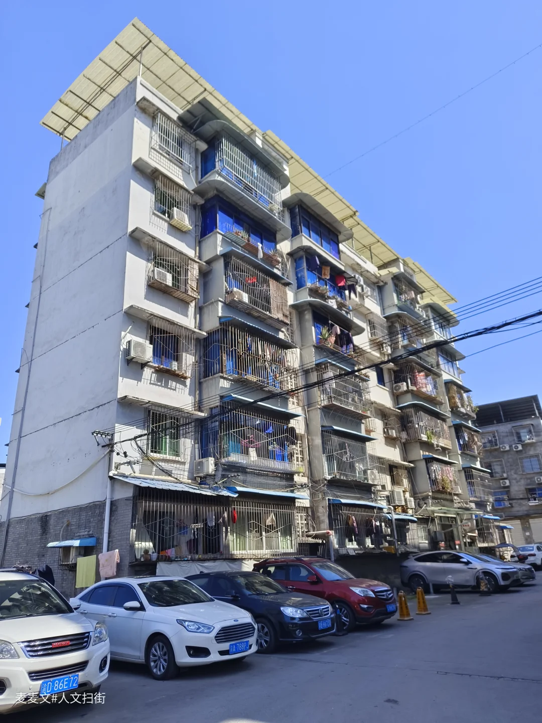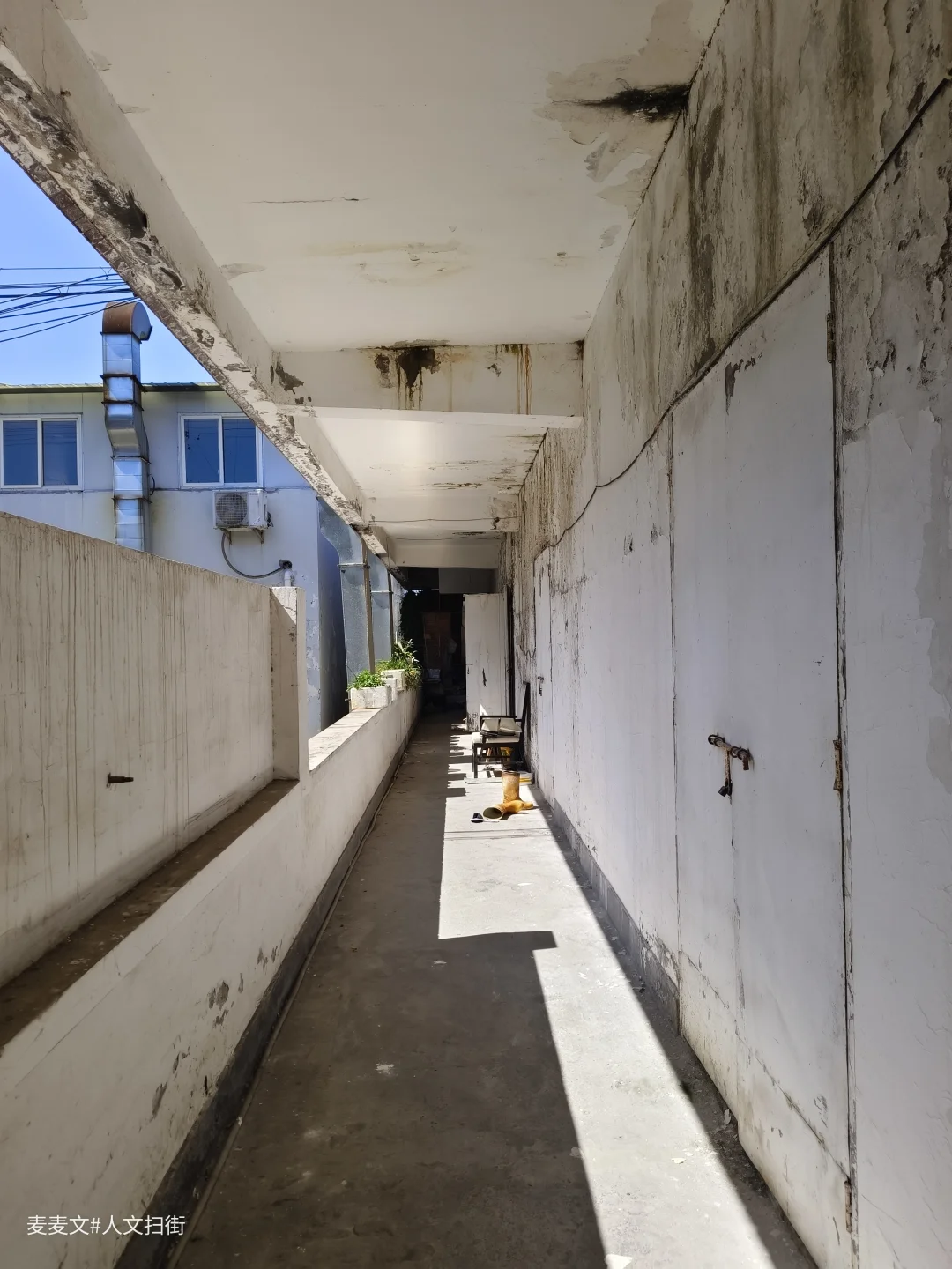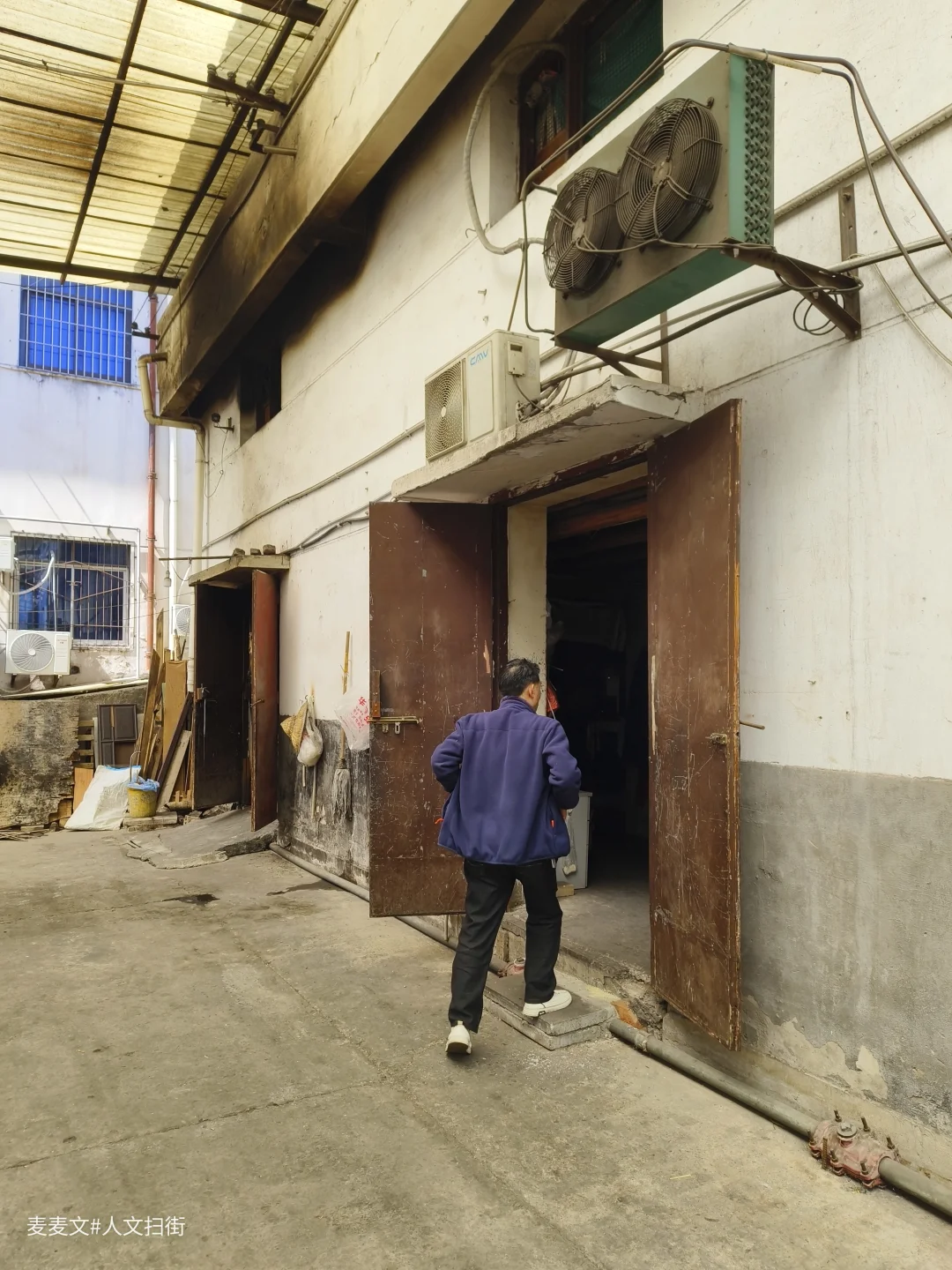 院内的老建筑爬满岁月痕迹,裸露的管线、掉皮的墙面,都在诉说着数十年的故事。仓库内的“渝北区学校粮食配送中心”还在运作,货车与私家车停满院落,老家属院的窗户里飘出生活气息,晾晒的衣物、盆栽的绿植,让这片工业旧址充满了人间烟火。