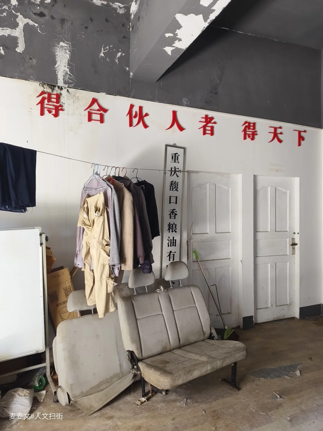 “得合伙人者得天下”的标语仍留在墙上,与散落的旧座椅、斑驳的走廊相映,仿佛还能听见当年粮油装卸的声响。老粮仓没有被时代抛弃,而是以另一种方式守护着渝北人的粮食安全,也留存着老两路最鲜活的记忆。