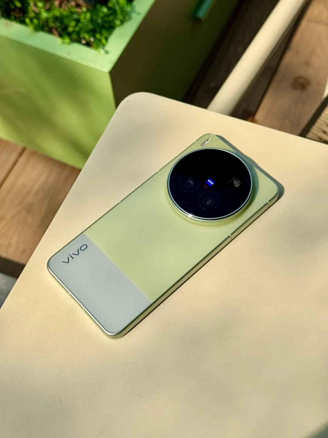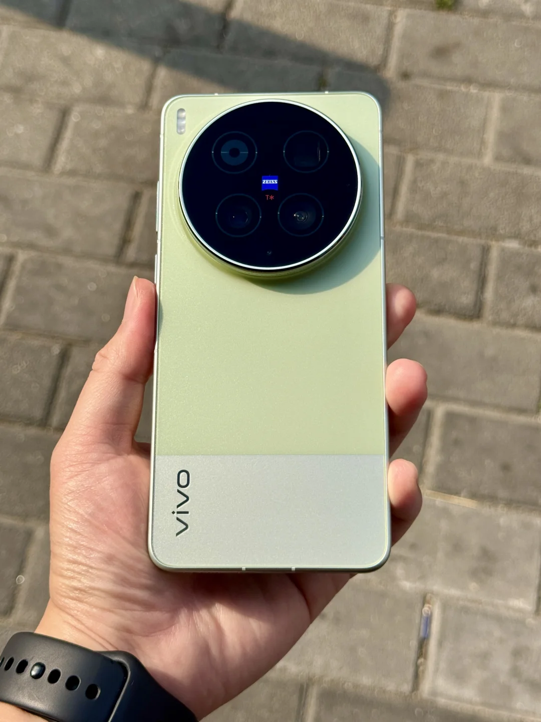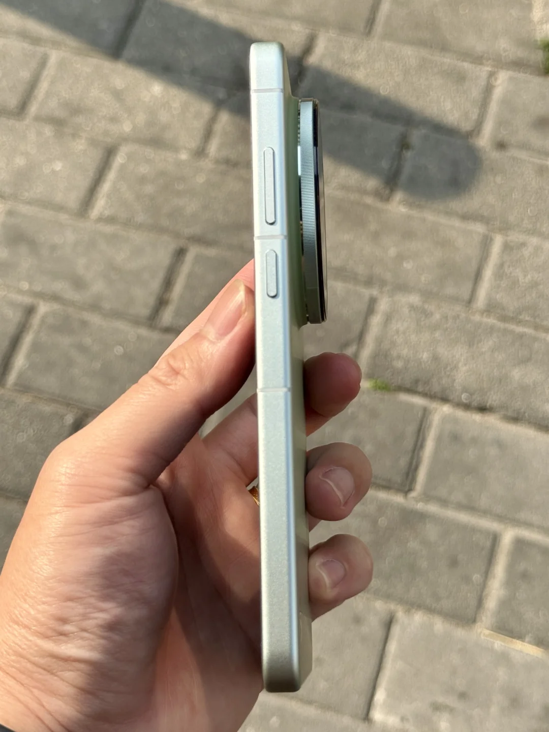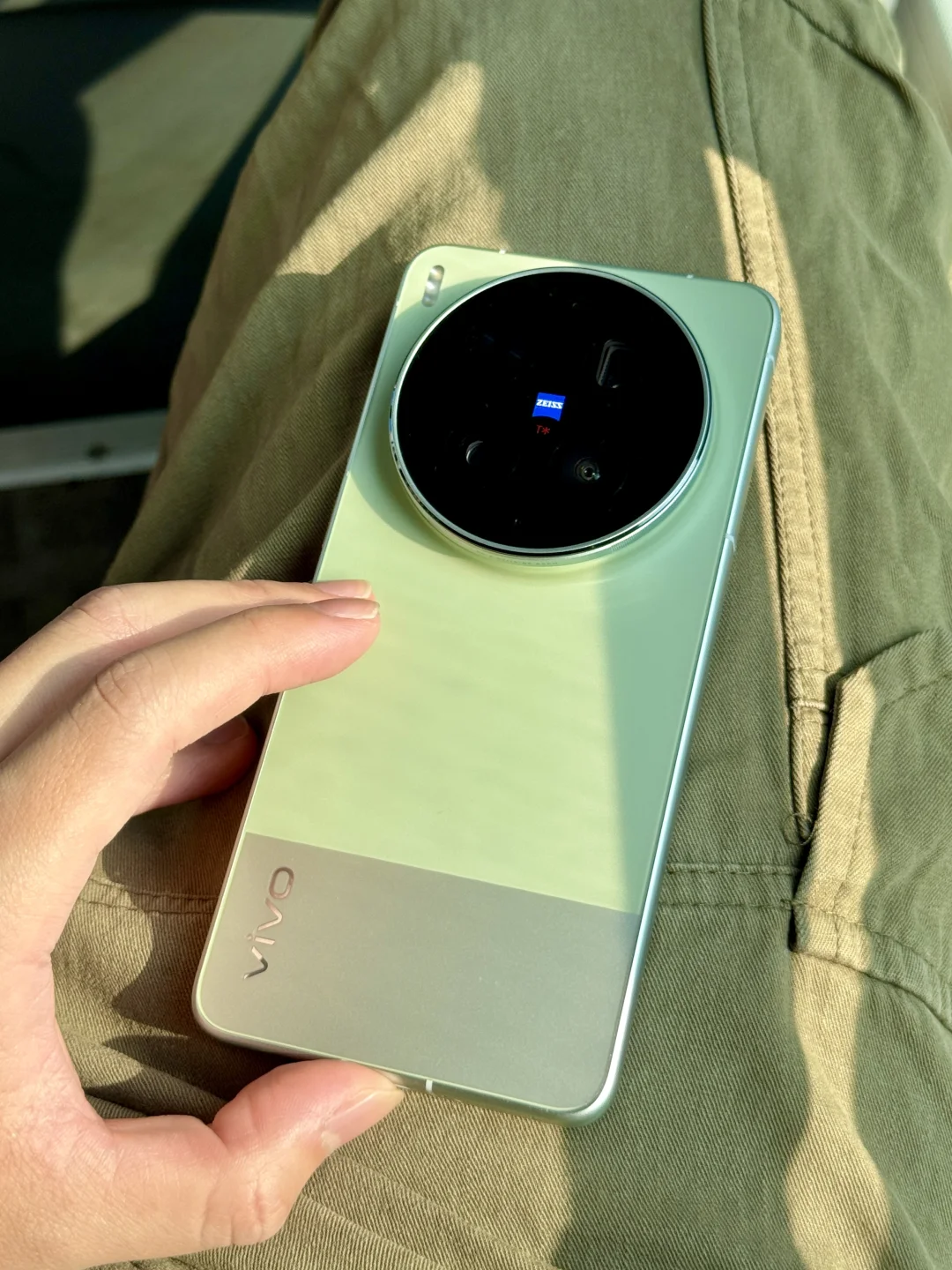 X300 Ultra 我已经上手用了一段时间了,很推荐你们去看看这款胶片绿配色! 这款配色真的好百搭,无论出现在咖啡厅,户外大路上,怎么拍怎么好看 机身的上半部分是雾面的浅绿,下半段是更干净的奶白。 给人一种清新、希望与安全感。 背后的这枚镜头真的很大,看起来有种浓浓相机味 没想到搭配上这种清新的颜色,使其在外观上看起来竟然有点的小清新? 机身厚度这次做的也很薄,上下的配重比例做的很好,我这种手小的拿着也不会吃力 推荐大家去线下店看看真机,真的很漂亮。