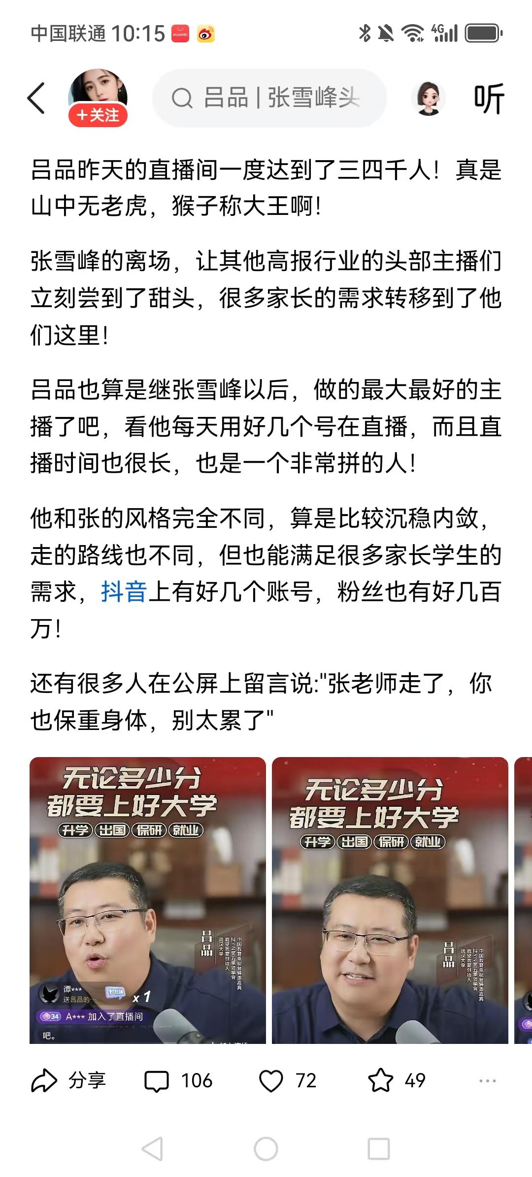 山中无老虎,猴子称大王。听说他们公司都是兼职做方案,对员工的压榨也很大,和张雪峰没有可比性。 动不动让你花钱进家长学院,看似忠厚,其实不太厚道。 我家没孩子上学,我也不大关心这种,但看这个吕品面相倒是忠厚老实,家长可能会有信任感。 张是这个行业的创始人,没他,这个行业结束了。 这个赛道,直接问ai就行了,要什么数据,哪一年的数据,只要网上有的,ai都能帮你找出来,他们也是在网上找的数据。 其他的做这件事的,除非能真的做到继续打破信息壁垒,真诚的给低层的孩子建议,否则早晚被抛弃。 以前关注过他,直播间里有事问他好几次也不鸟你,估计是没买他的东西吧,不实诚。