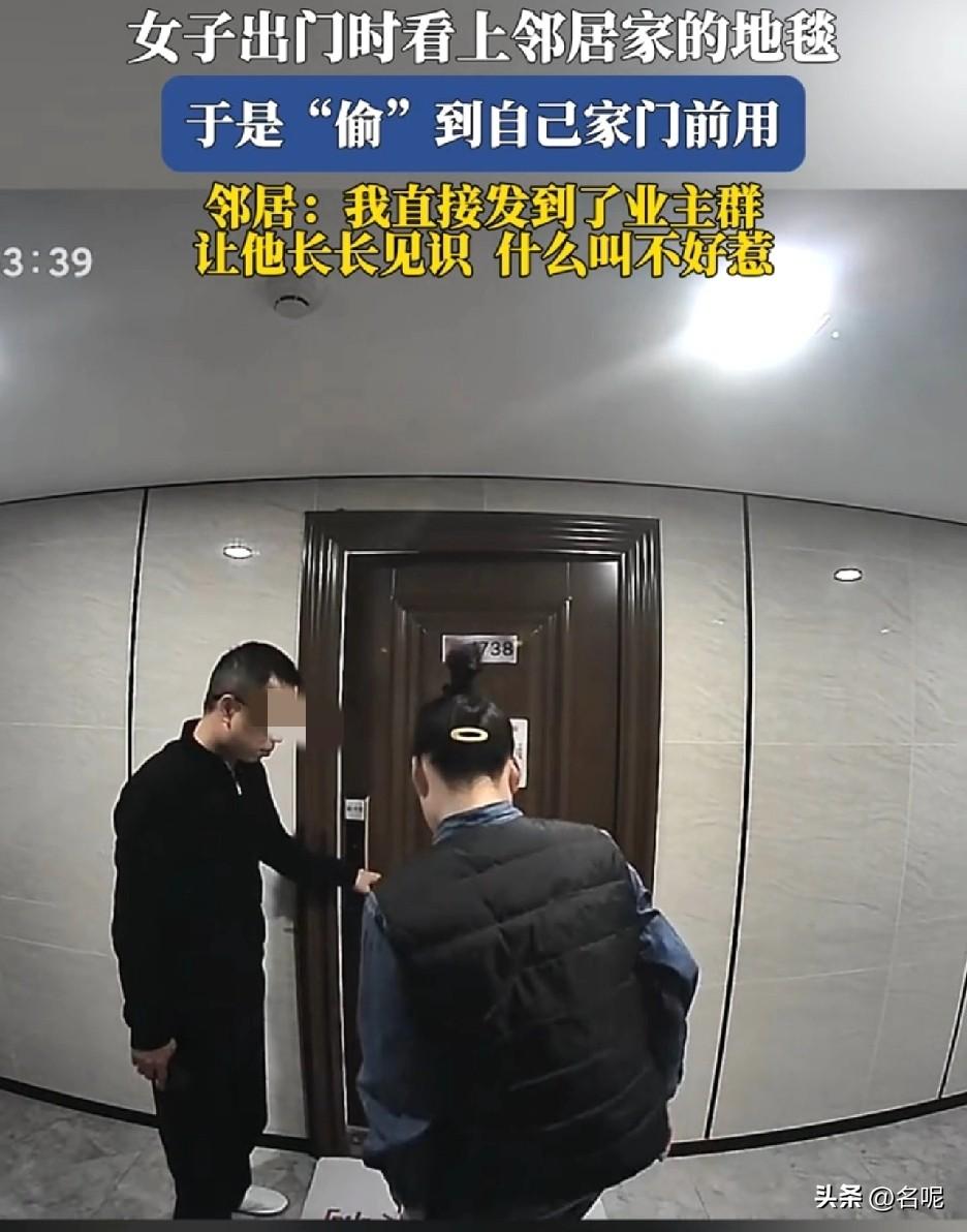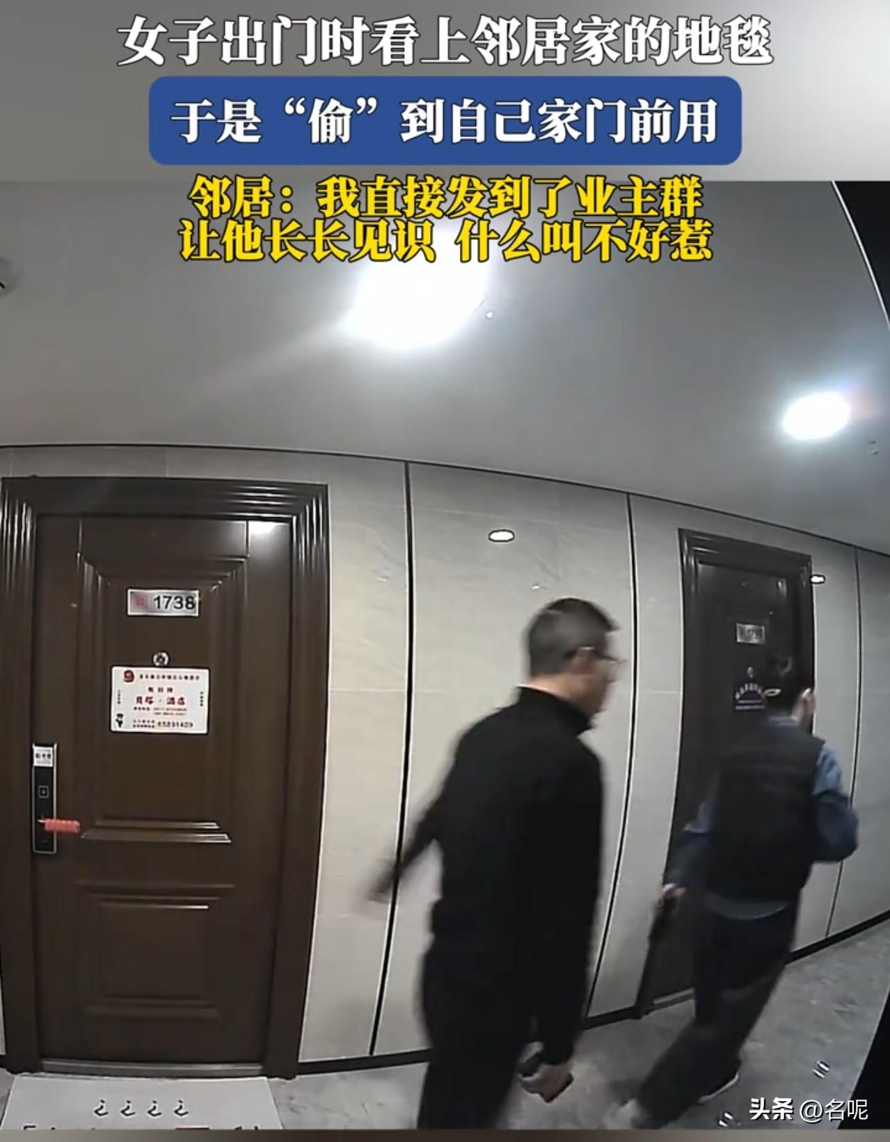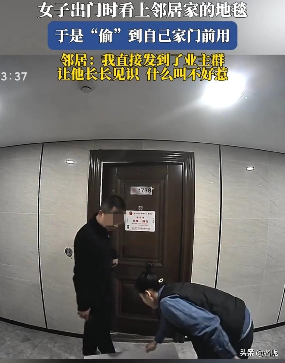 好家伙,现在偷都这么明目张胆了吗? 云南,一女子出门时看上邻居家的地毯,竟直接将地毯挪到自家门口使用,随后大摇大摆地走了。邻居见状火冒三丈,直接把视频发到业主群里。 这都什么人,穷疯了吗?就一张地毯,至于吗?把自己名声都搭进去了。女子在那拖,身后的老公全程不阻拦,甚至让位置给女子放。真是不是一家人不进一家门,两人品行如出一辙。 远亲不如近邻,人家都是搞好邻居关系,她倒好,整这一出,生怕她跟邻居关系太好? 邻居也是被气疯了,直接晒视频让大家认清这一家人的为人,宣泄情绪的同时,还提醒大家以后都留个心眼。 好好的邻里情分彻底闹僵,为了一块不值钱的地毯,丢了脸面、失了人心,到头来真是得不偿失。
