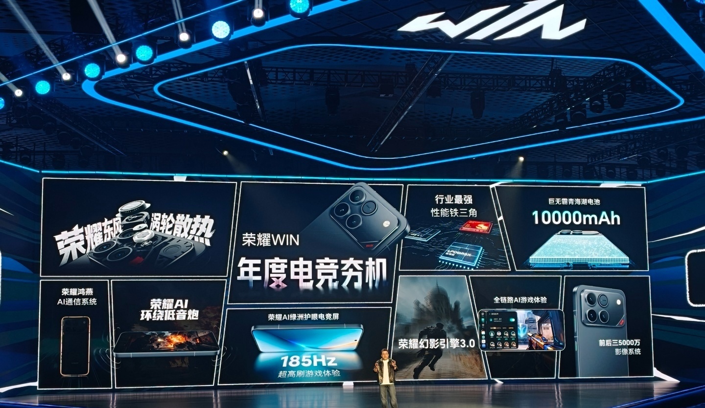 作为参考,荣耀 WIN 系列正面提供一块 6.83 英寸 2800x1272 分辨率 185Hz 刷新率 LTPS OLED 直屏,支持 6 款国民级头部手游 GPU 超帧超分,同时提供了 5920Hz 零风险 PWM 调光、3D 游戏防晕眩等护眼功能。此外,该机还配备了荣耀东风涡轮散热(内置风扇)、10000mAh 巨无霸青海湖电池、至高骁龙 8 Elite Gen5 处理器等。
