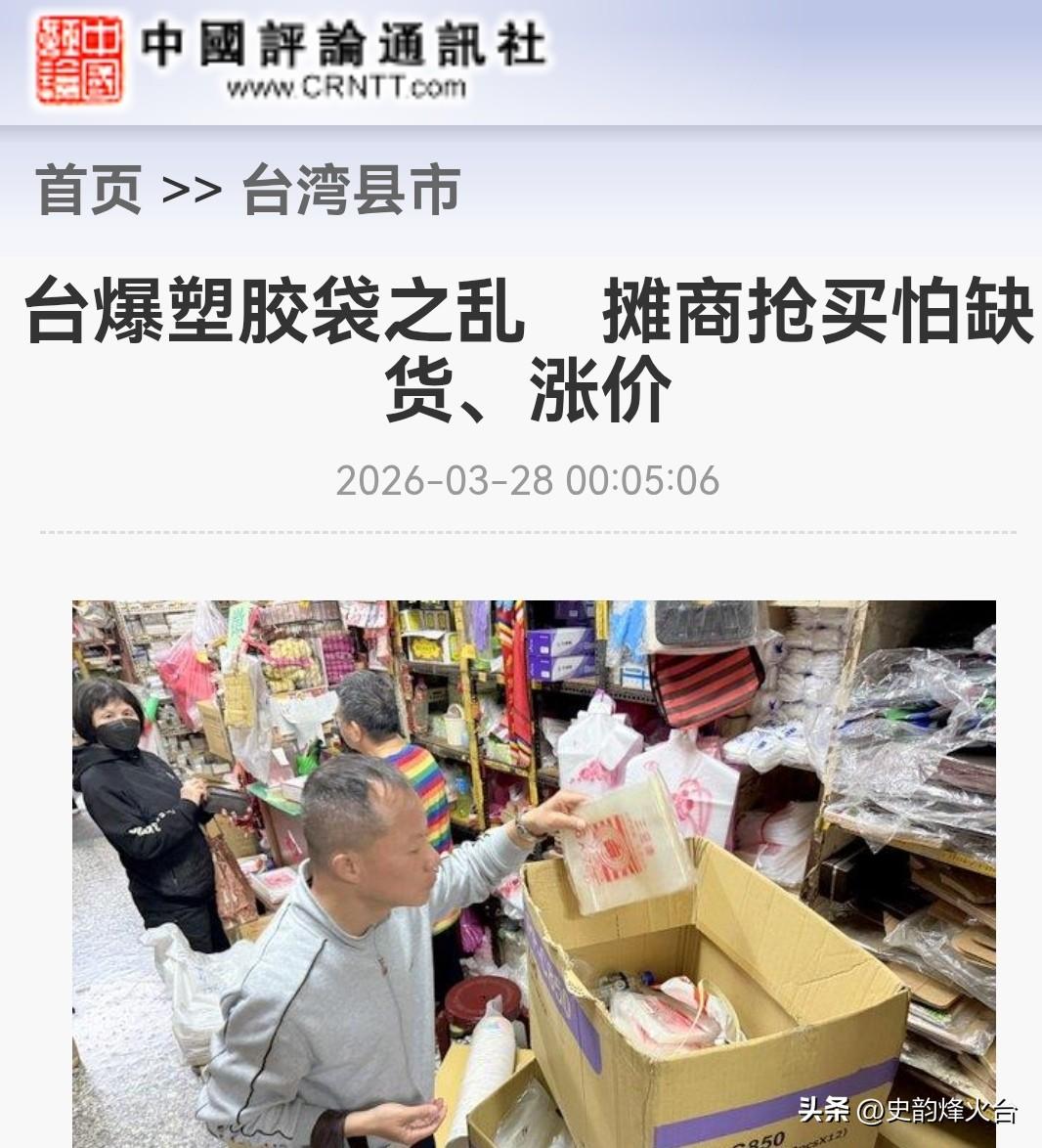 就在刚刚, 高雄三凤中街的老字号源茂塑胶行, 还在被抢购的人潮围着。 3月28日,中评社发自高雄的最新消息,中东战火引发全球石化原料供应链大乱,直接在台湾引爆了一场“塑胶袋之乱”。 这条高雄历史最悠久的南北杂货街,这两天彻底乱了套。 前来扫货的摊商、民众挤在店面里,翻箱倒柜找货,缺货、涨价的抱怨声此起彼伏。 店家老板连日被疲劳式提问磨得身心俱疲,只说了一句大实话:货量少了三分之一,没断货,但上游送来多少,当天就被抢光多少。 涨价是明明白白摆在台面上的。 摊贩最常用的8两装塑胶袋,之前一包售价20元新台币,现在直接涨到25元,涨幅高达25%。 连带餐饮常用的纸碗也跟着涨价,每100元的货,要多收5元。 来补货的民众说得实在:现在还没到完全断货的地步,但已经不好买了,更怕接下来价格越涨越凶,只能先囤点货。 很多人觉得,不就是个几毛钱的塑胶袋吗?至于闹成这样? 说白了,你太小看这薄薄一层塑胶袋了。 它就像台湾庶民经济的“毛细血管”,夜市的小吃摊、传统市场的菜贩、街边的早餐店、做外带的小餐馆,哪个离得开它? 就像高雄市摊贩协进会理事长苏致荣说的:没有袋子,不是少赚,是直接不能做生意。 这话一点不夸张。 客人买了卤味、买了饭团、买了蔬菜水果,你连个装的袋子都没有,生意还怎么做? 这根本不是单纯的物价波动,是整个庶民经济的链条,被硬生生卡住了脖子。 很多人可能会问,不就是个塑胶袋吗?台湾这么发达的制造业,怎么连这个都供不上? 这就像造汽车,不是你有轮胎、钢板、发动机,就能造出好车、撑起一个完整的汽车产业。 塑胶袋的核心,是上游的石化原料。 台湾的石化产业,看似有不小的炼化产能,可核心的原油、基础石化原料,高度依赖进口,中东更是最重要的供应来源之一。 中东战火一起,全球航运、供应链大乱,原料价格飞涨、船期不稳,台湾这种“原料靠进口、市场靠外销”的产业结构,根本没有任何抗风险能力。 上游原料一紧,下游的塑胶制品厂直接减产,传导到终端市场,就是摊商买不到袋子、老百姓要花更多的钱。 反观咱们,从原油开采、炼化,到中游的塑胶原料生产,再到下游的各类制品加工,早就形成了完整可控的全产业链。 就算国际市场有剧烈波动,国内有足够的产能、足够的储备稳住民生基本盘,根本不会出现连个塑胶袋都要全民抢购的局面。 这个时候,最该站出来的民进党当局在哪? 苏致荣,这位民进党籍的高雄市议员参选人,都忍不住站出来喊话,说已经接到大量摊商陈情,基层经济已经面临实质危机,呼吁当局立即介入稳定供应。 可民进党当局呢? 之前搞限塑令的时候,条条框框一套比一套严,管得比谁都宽。 现在连老百姓最基本的塑胶袋供应都稳不住,却连个像样的应对动作都没有。 之前天天喊着“台湾经济韧性十足”,现在连个几毛钱的塑胶袋都兜不住,所谓的韧性,到底在哪? 说到底,台湾经济的真相,从来都不是台积电那点高端产业的光鲜。 是夜市里一盏盏亮着的灯,是市场里一个个守着摊位的小贩,是千千万万靠小生意糊口的老百姓,他们才是台湾经济的基本盘。 民进党当局天天忙着搞政治操弄、喊空洞的政治口号,却连老百姓手里一个能平价买到的塑胶袋都保障不了。 这场“塑胶袋之乱”,乱的不只是一条杂货街的货价,更是底层老百姓对当局无能的彻底失望。 最后为这场乱局买单的,从来都是这些只想好好做个小生意、好好过日子的普通人。