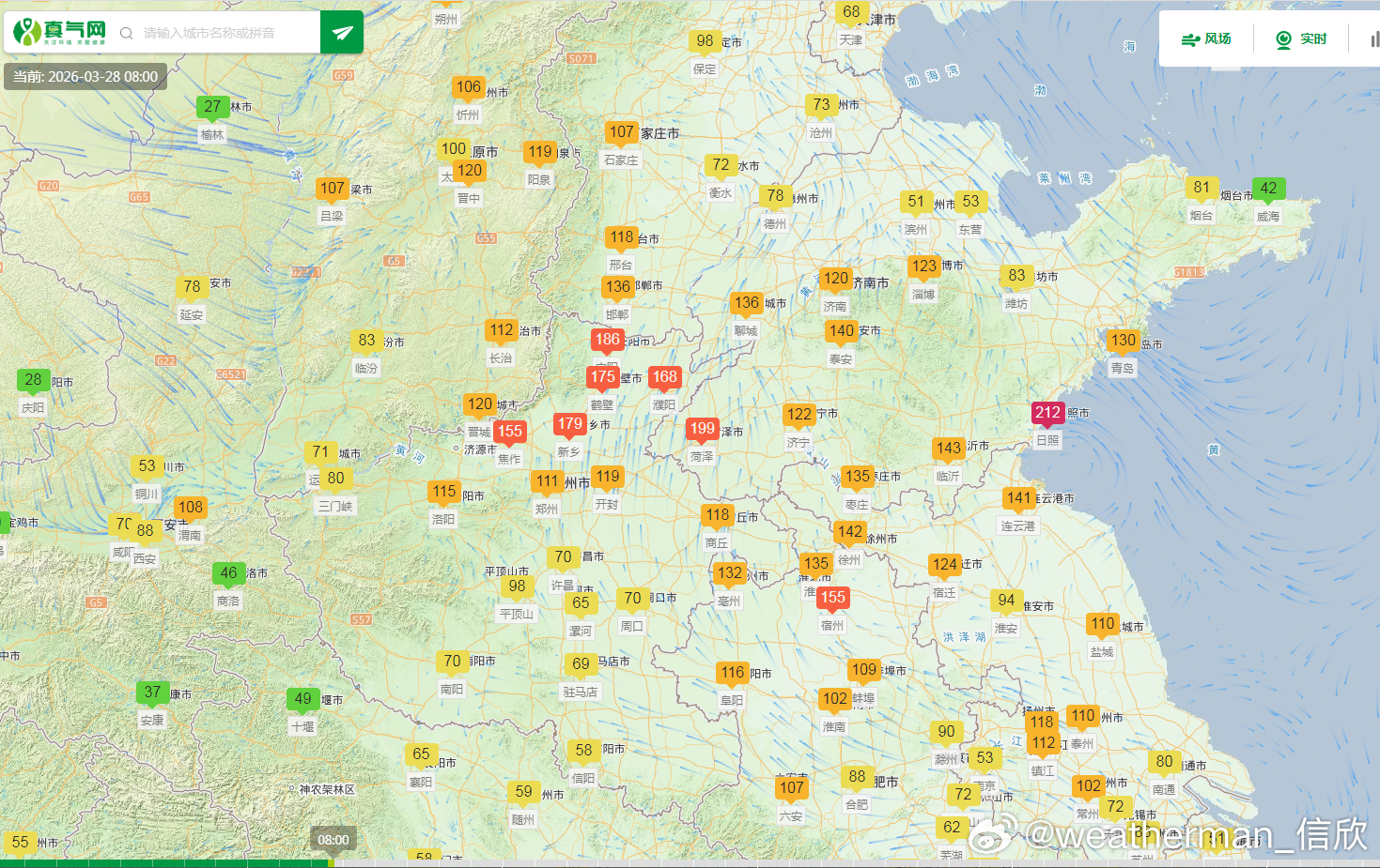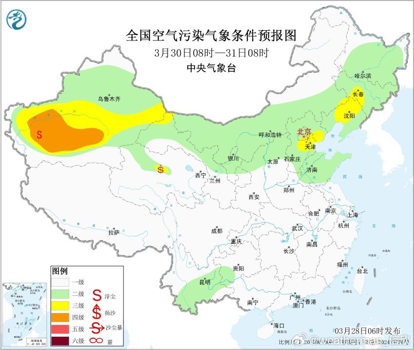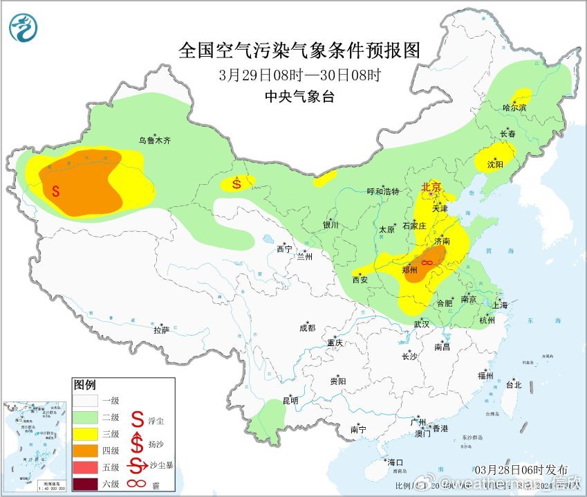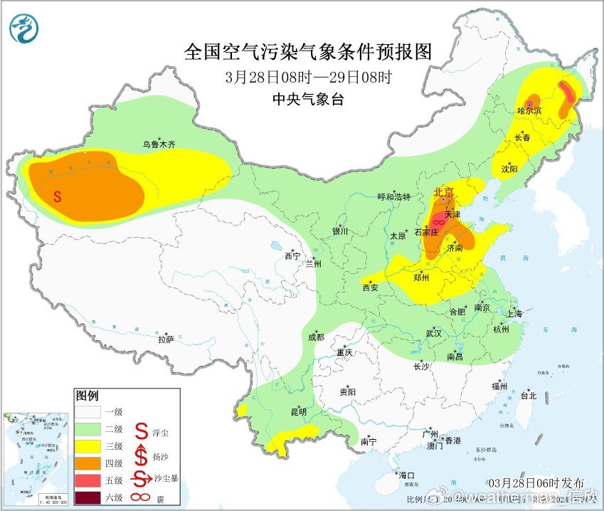 预计,28日至29日白天,华北、黄淮、东北等地大气扩散条件较差,有轻至中度霾,局地重度霾。29日夜间-30日,受冷空气影响,霾天气逐渐减弱或消散。此外28-29日,受境外(中南半岛烧荒)传输影响,云南南部的部分地区有轻度霾。新疆塔里木盆地,未来依然多沙尘。