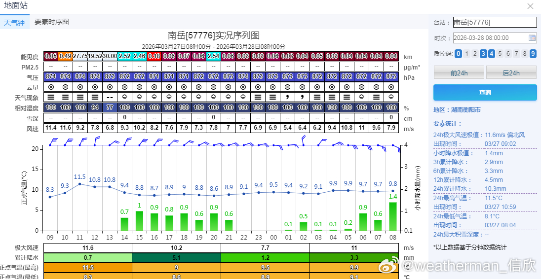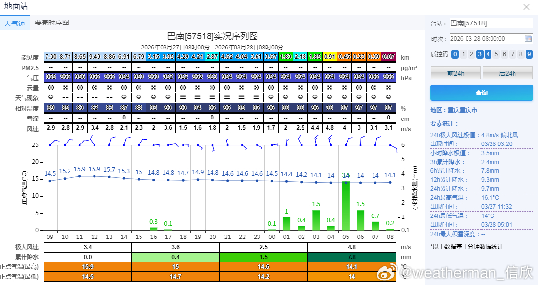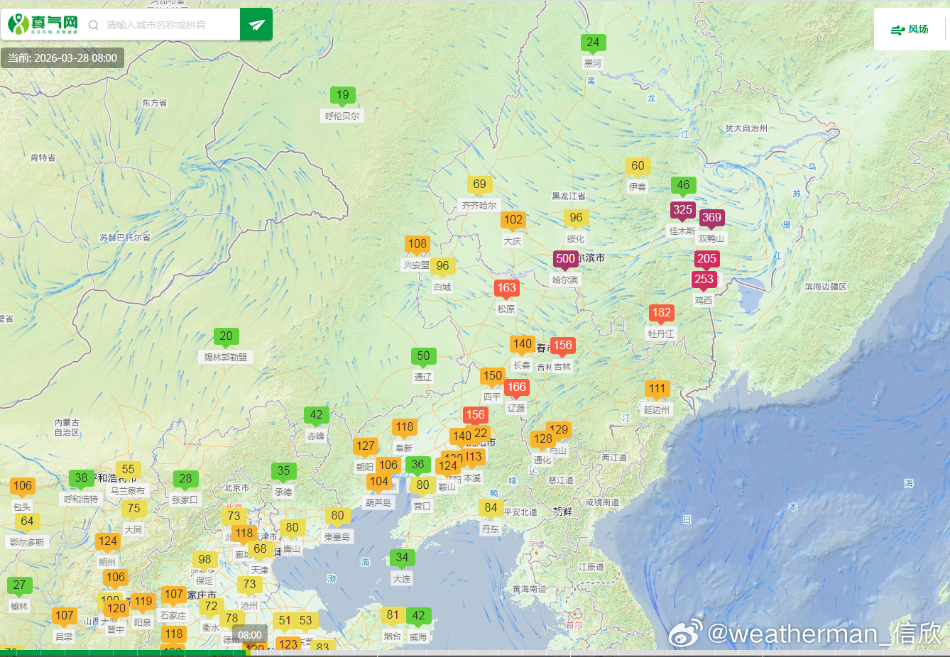 【雾 霾 沙尘】从今晨空气质量看,东北、华北南部、黄淮一带转差。哈尔滨空气质量爆表,此外河南北部等地出现中度污染,山东日照出现重污染。此外,新疆塔里木盆地的沙尘持续。另外,今晨在四川重庆贵州广西湖南江西浙江安徽部分地区出现了大雾。部分站点是烟雨蒙蒙,比如湖南南岳能见度38米、重庆巴南能见度65米。