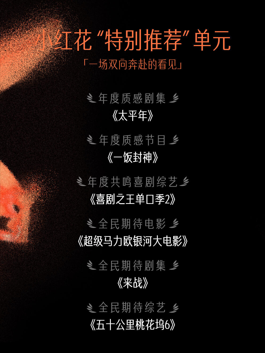 小红花“特别推荐”单元年度质感剧集《太平年》年度质感节目《一饭封神》年度共鸣喜剧综艺《喜剧之王单口季2》全民期待电影《超级马力欧银河大电影》全民期待剧集《来战》全民期待综艺《五十公里桃花坞6》