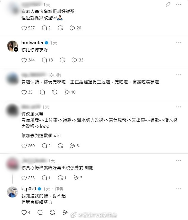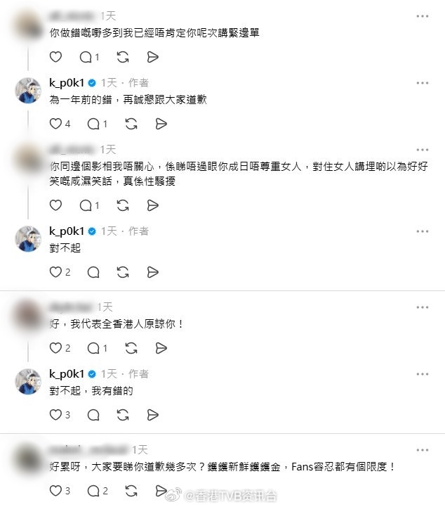 保錡逐个留言回复认错在网友的批评下,保錡多次在留言区逐个回复并认错:“对不起,我知我错的地方!”“对不起,反省了很久!会尊重对方,感谢教导。”“对不起,不会再乱拍照,对不起。”但有网友直指保錡:“到现在你都没明白自己真正的问题”“有些人每次道歉都很诚恳,但就是不改过”“做错>>道歉>>复工,循环再错”“他不是知错,是知道没工作”。