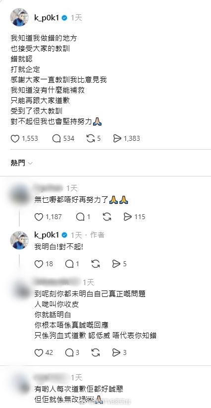 保錡:错就认打就企定保錡前日(26日)突然在Threads上道歉,希望外界给予改过自新的机会:“我知道我做错的地方,也接受大家的教训,错就认,打就企定,感谢大家一直教训我给意见我,我知道没有什么能补救,只能再跟大家道歉。受到了很大教训,对不起但我也会坚持努力”,可惜大部分网友并不买账。