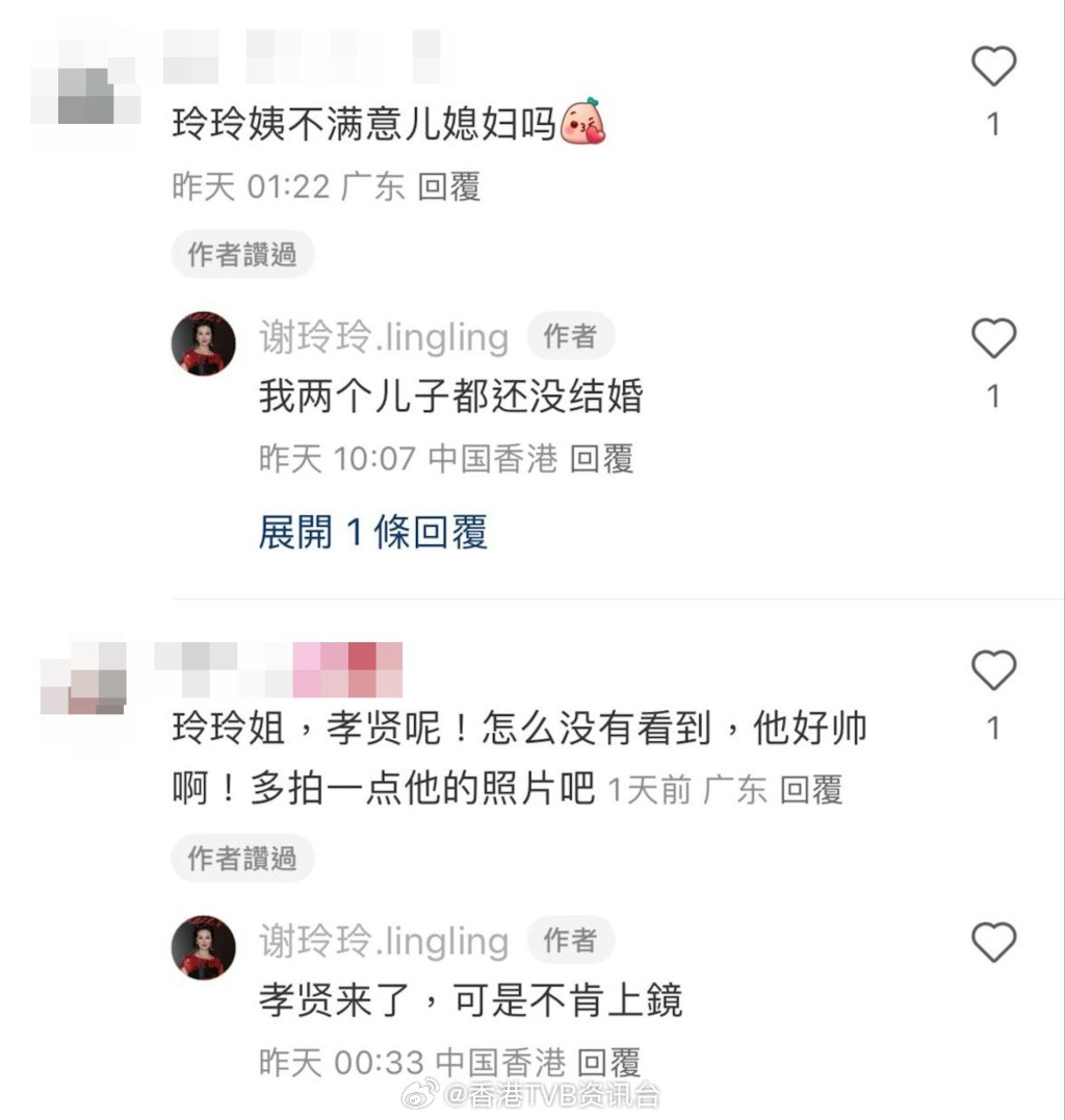 胡美贻一直低调未承认恋情胡美贻2022年与从事餐饮的富豪财俊Reeve分手后,被曝出恋上谢玲玲儿子林孝贤,更进驻男友这间市值4亿、位于九龙塘的独立屋同居。不过胡美贻一直低调未承认恋情,也曾有传不获谢玲玲认可,谢玲玲仅称自己是开明妈妈,不过问子女感情,并表示“我两个儿子都还没结婚”。