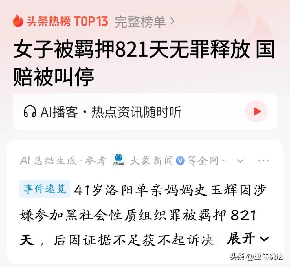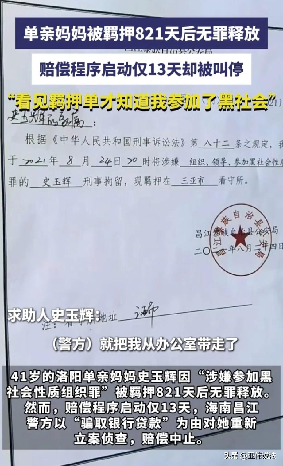 海南,41岁单亲妈妈因为涉嫌参加黑社会被羁押了821天,后来,检察院认定证据不足,不予起诉,将她无罪释放,并同意赔偿她的损失。女子松了口气,以为噩梦终于要结束了,谁知,赔偿程序才启动13天,警方竟以“骗取银行贷款”为由,对她重新立案侦查,赔偿的事也暂且中止。女子懵了,骗贷的事法院都已经认定了,不构成犯罪,为何又要再来一次。对此,警方的解释让她无法接受。 41岁的洛阳单亲妈妈史玉辉,这几年的遭遇,说起来像一场醒不来的噩梦。 2022年底,她是一名物业经理,却因“涉嫌参加黑 社会性质组织罪”被警方羁押,这一关就是整整821天。 在看守所的日子里,她每天都在煎熬:一边担心远在洛阳的孩子没人照顾,一边坚信,自己没做错,一定要等一个清白。 无数个夜晚,她睁着眼睛到天亮,就盼着能有洗刷冤屈的那天。 终于,2025年5月,她拿到了检察院出具的《不起诉决定书》,白纸黑字写着“证据不足,不予起诉”。 史玉辉蹲在检察院门口,抱着那张薄薄的纸哭了好久,快两年半的委屈、恐惧和期盼,在这一刻全化作了眼泪。 她以为,悬在头顶的乌云终于散了。 同年8月,好消息再次传来:检察机关作出《刑事赔偿决定书》,同意赔偿她被羁押期间的人身自由赔偿金和精神损害抚慰金。 史玉辉算了算,这笔钱足够她带孩子回洛阳租个稳定的房子,再给孩子相对稳定的生活。 她甚至开始规划,等拿到钱就去买张回家的火车票,再也不踏足这个让她心碎的地方。 可谁能想到,赔偿程序才启动13天,一道突如其来的通知书,把她的希望彻底碾碎。 警方送来立案告知书,称要以“骗取银行贷款”为由对她重新立案侦查,同时通知检察机关,中止对她的赔偿程序。 史玉辉当场就懵了,这个“骗取银行贷款”的指控,早在之前的涉黑案件庭审中,法院就已经明确认定不构成犯罪,相关证据也被全部驳回。 怎么现在案子结了,又把这事儿翻出来了? 带着满肚子的疑问和不甘,3月18日,史玉辉再次来到检察院,想要个说法。 接待她的检察官听完她的质问,表示,刑事案件办理过程中发现新线索,重新立案是正常流程,就算是几十年前的案子,只要有新证据也能翻案。 史玉辉的心一下子提到了嗓子眼,她查过法律,赔偿中止的期限是一年,如果一年后他们再找别的理由立案,那自己的赔偿是不是永远都拿不到了? 检察官回答,理论上不排除这种可能。这个回答像一盆冷水,浇得她浑身冰凉。 从检察院出来,史玉辉又马不停蹄地赶到公安局,民警解释,重新立案的证据材料是检察院移交给我们的,目前正在核查,收集证据只是正常办案流程。 当他继续追问细节时,对方以办案细节需要保密,不方便透露为由,挂断了电话。 坐在出租屋里,史玉辉只觉得浑身发冷。 她一个单亲妈妈,带着孩子本来就不容易,好不容易等到了“无罪”的结果,以为能拿到赔偿,给孩子一个稳定的生活,可现在,一切又回到了原点。 她不知道自己还要等多久,也不知道这场“拉锯战”什么时候才能结束。 《关于办理刑事赔偿案件适用法律若干问题的解释》第二条规定∶赔偿义务机关有证据证明尚未终止追究刑事责任,且经人民法院赔偿委员会审查属实的,应当决定驳回赔偿请求人的赔偿申请。 史玉辉案中,检察院以“证据不足”作出不起诉决定,已属法律上终止追究刑事责任 ,其依法申请国家赔偿符合法定条件。 但警方以法院已认定不构成犯罪的“骗贷”事实重新立案,本质是对同一事实重复追诉。 根据“一事不再理”原则 ,生效司法认定对同一行为具有既判力,无新事实、新证据不得再行立案侦查。 本案中,警方所称“检察院移交材料”并非新证据,而是原案已被法院否定的旧材料,重新立案缺乏合法基础。 司法机关若以“新线索”为由随意重启已决事实,将使国家赔偿制度形同虚设,严重侵犯公民获得赔偿的法定权利。 史玉辉可以固定相关证据,向有关部门投诉维权。 对此你怎么看?
