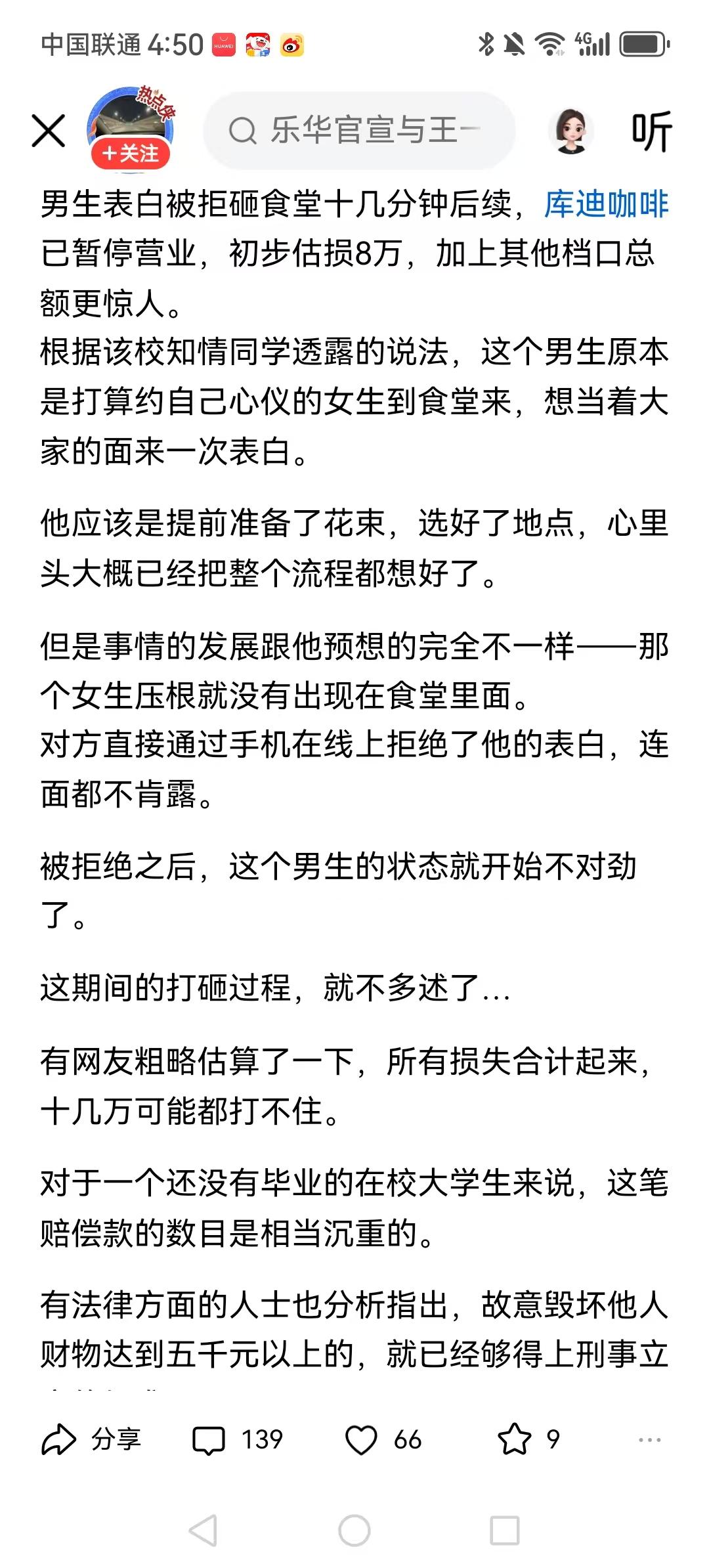 男生表白被拒砸食堂十几分钟后续。这个故事唯一令人欣慰的是,这个男生是直男。 不管损失多少,估计最后都赔不了多少,因为他毕竟还是个孩子,不信走着瞧。 怎么会有这种憨货?他不会天真的以为砸坏东西不用负责吧? 开除吧,我要是和他同宿舍,我都害怕这种人。 拒绝是对的,简直就是个定时炸弹,偏激极端暴力,这种人不能结婚,搞不好一发疯会杀人。 太不理智,人家女孩子手机拒绝已经给了台阶下,当面拒绝更难看啊,太冲动了