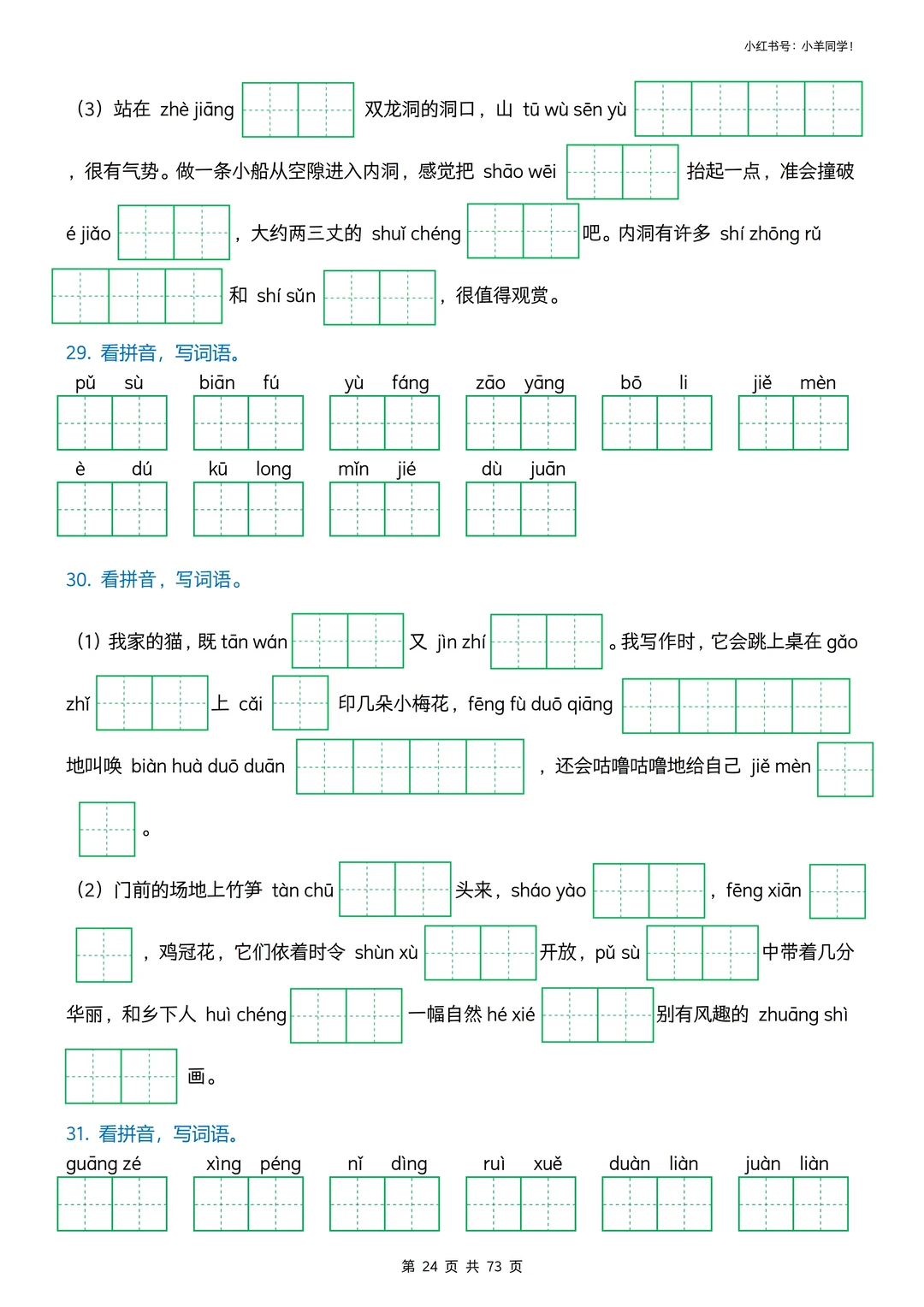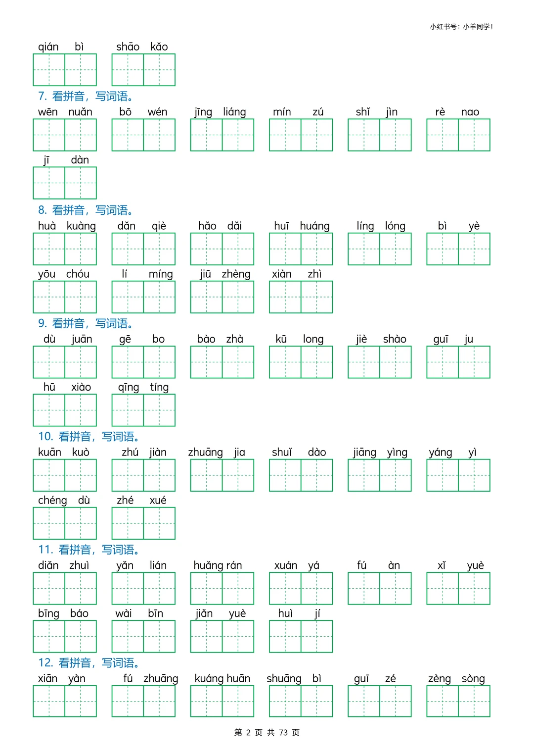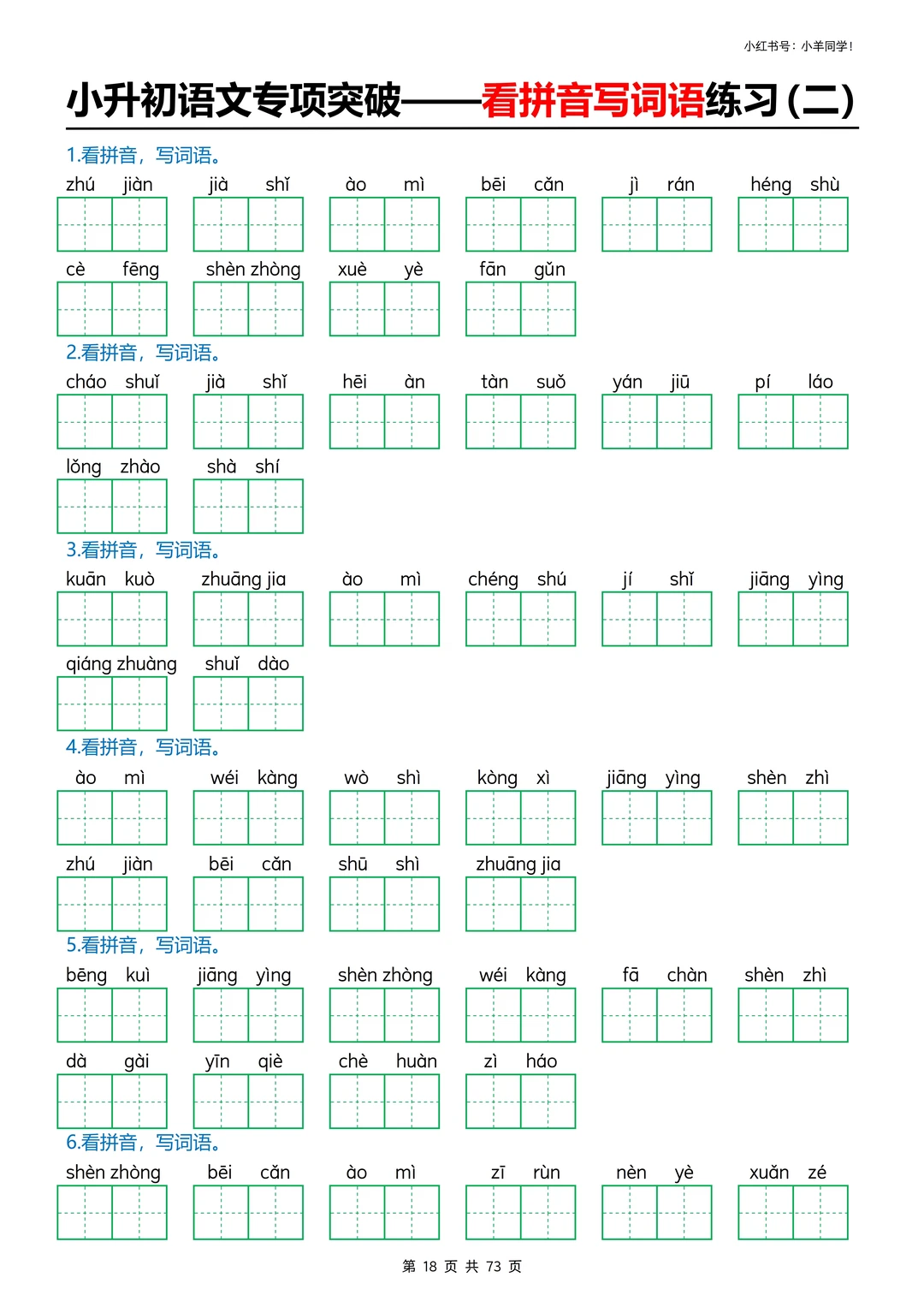 看拼音写词语专项训练挖到宝啦! 娃字词丢分、书写不规范?这套直接搞定✅ ✅ 3种题型:情景式+田字格+括号版,练写+检验一站式 ✅ 全覆盖小学易错字、高频字,精准踩考点,避开丢分坑 ✅ 题目版73页+答案版9页,可打印,家长省心娃高效 字词是语文基础,每天10分钟,夯实基础冲小升初✨ 🛍️评论区置顶链接可获取完整版。