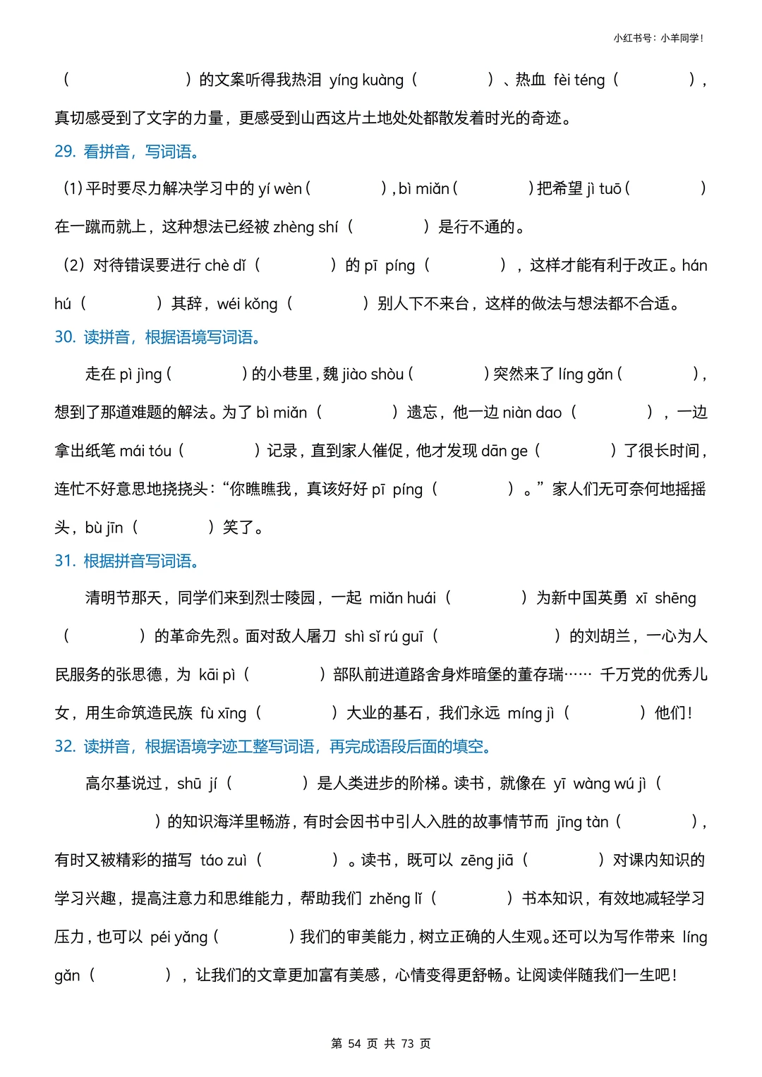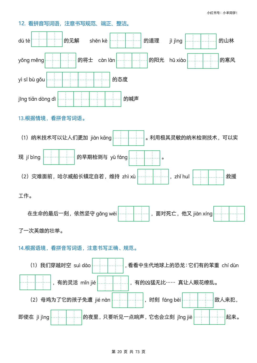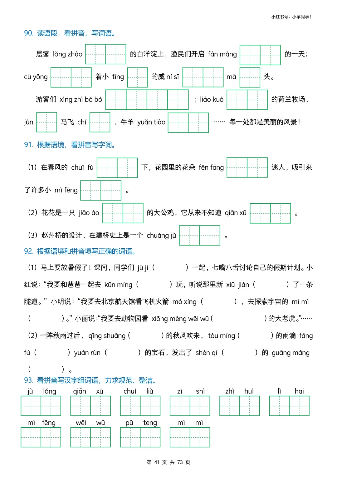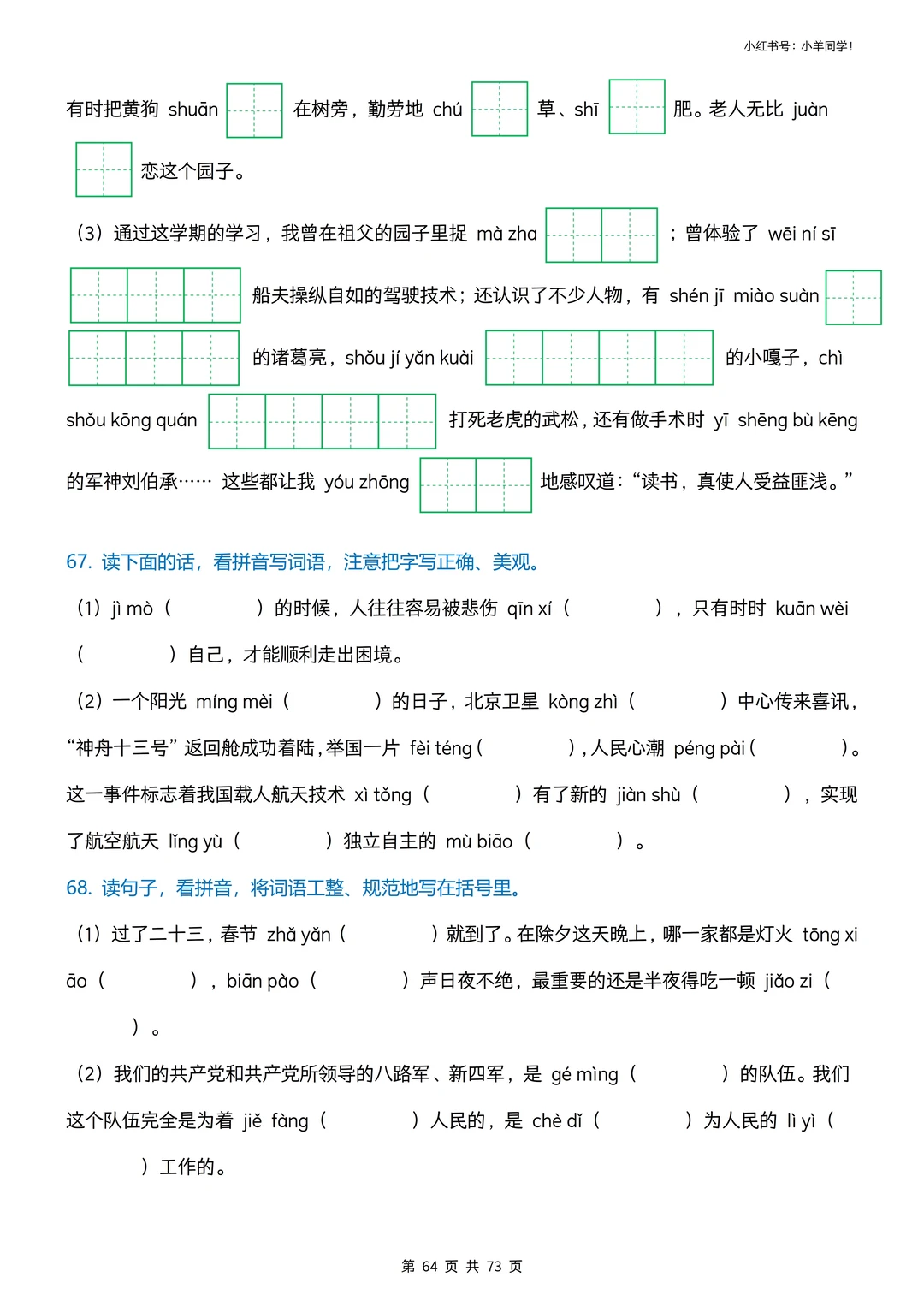 看拼音写词语专项训练挖到宝啦! 娃字词丢分、书写不规范?这套直接搞定✅ ✅ 3种题型:情景式+田字格+括号版,练写+检验一站式 ✅ 全覆盖小学易错字、高频字,精准踩考点,避开丢分坑 ✅ 题目版73页+答案版9页,可打印,家长省心娃高效 字词是语文基础,每天10分钟,夯实基础冲小升初✨ 🛍️评论区置顶链接可获取完整版。
