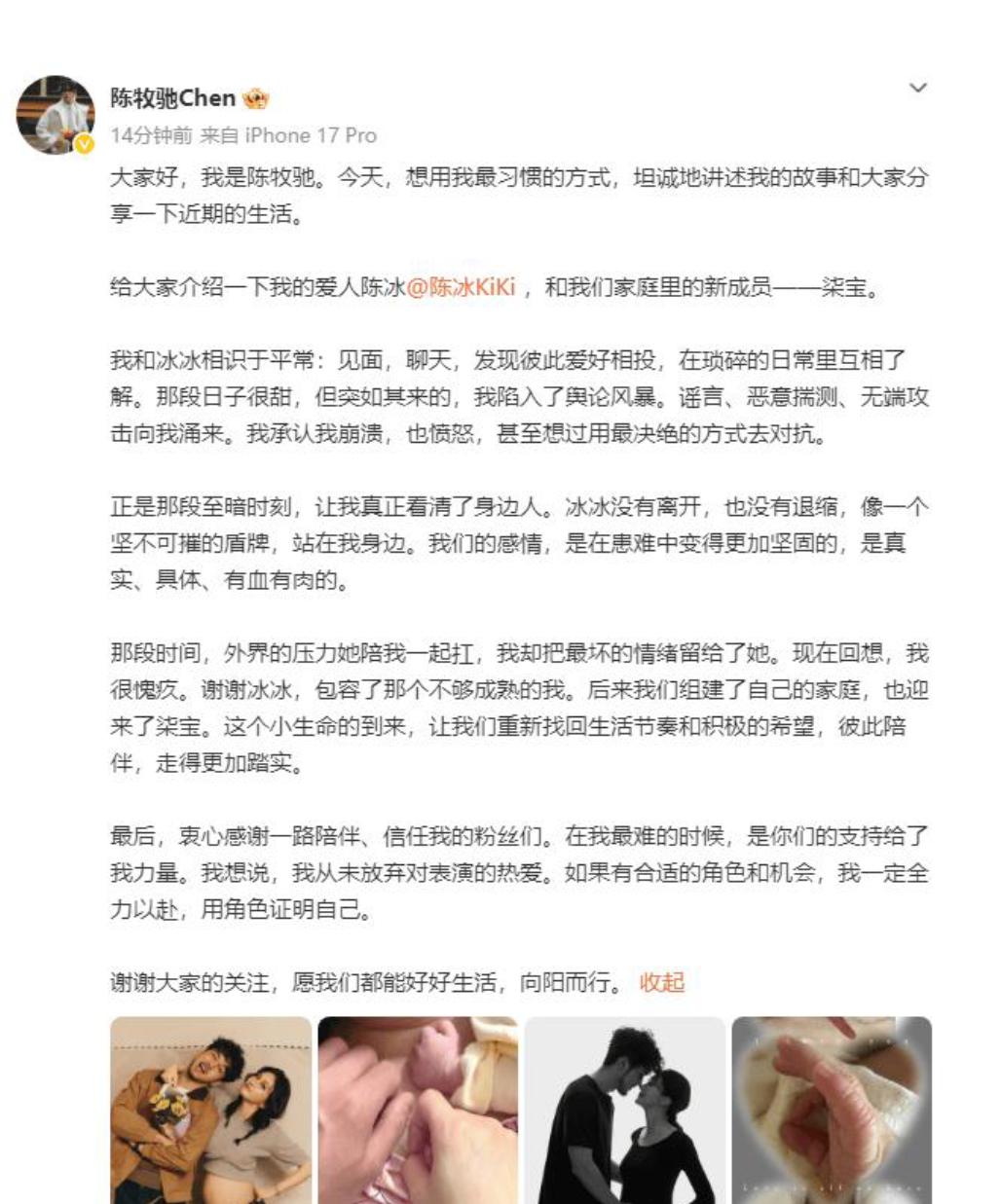 娱乐圈又一喜讯传来,陈牧驰陈冰官宣得子,并晒出一家三口碰拳照,好温馨有爱。